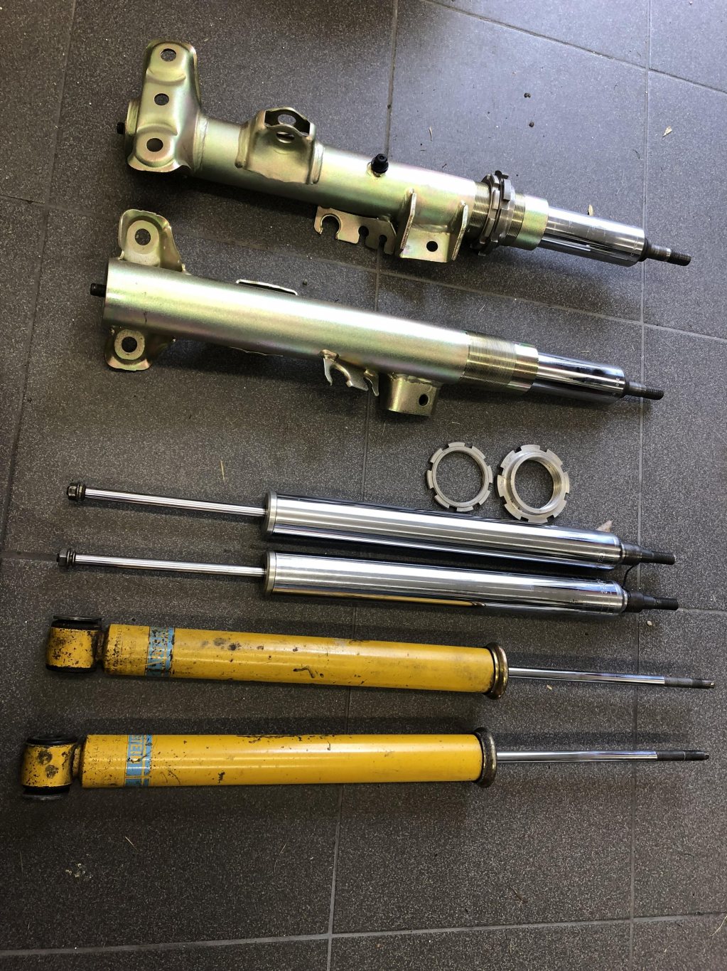 E36 fjäderben fram, renoverade och ytbehandlade med M3an kränghämmarfäste. Fjäderbenen är från ett DS Motorsport chassiekit baserat på bilsteindelar och de dämparna medföljer som reserver/ämne. (lösa på bilden) Stötdämparna är Bilstein Grupp N 350/300 vilket lär vara en av de hårdare sättningarna. Fjädersäten och kontramutter ingår E36 Bilstein Grupp N bak, 211/240-sättning. Fula men fullt fungerande. Komplettera med fjädrar och du har ett komplett kit som kvalitetsmässigt vida överstiger ett nytt "8000kr kit". Pris 5000 kr el hbj, finns i Löddeköpinge och jag slipper helst skicka.. 0708836930 Mess funkar bra, är dålig på att svara.