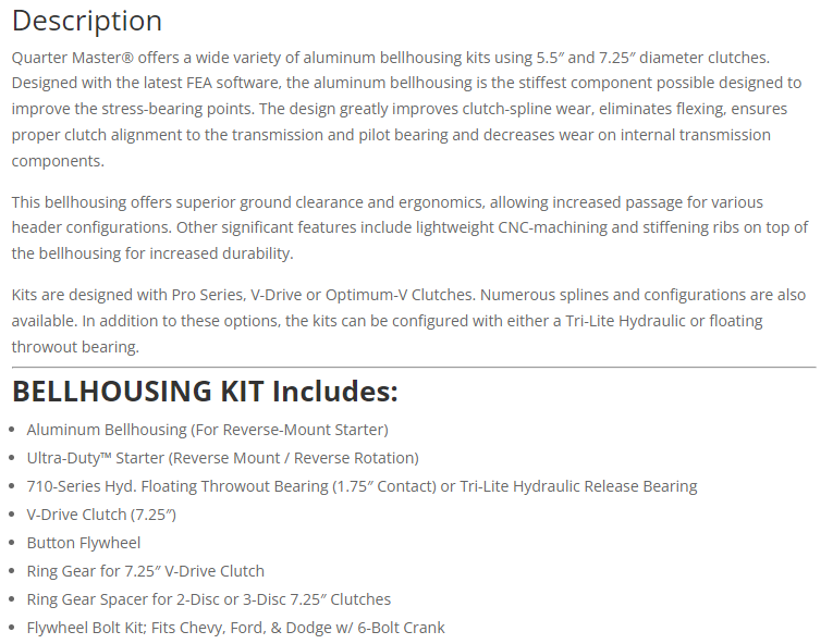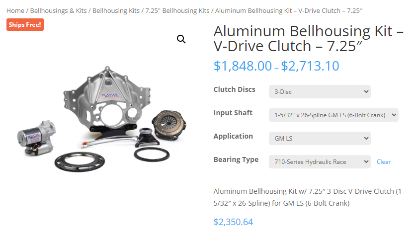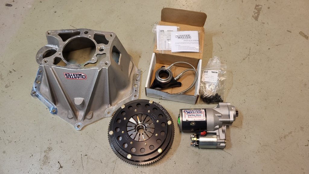 Har ett helt nytt kit från QuarterMaster för Chevy LS-motorer, med mindre diameter på svänghjul och special sprängkåpa/bellhouse med startmotor riktad bakåt - för att kunna montera motorn riktigt lågt (vid användning av lågt torrsumpstråg). Kopplingen är en treskivig 7,25" som tål väldigt höga moment, inklusive hydrauliskt urtrampningslager. Nypris idag: 2350 dollars = 25.850 kr (+frakt och tull) Mitt pris: 18.000 kr - SÅLT! Första kontakt via PM