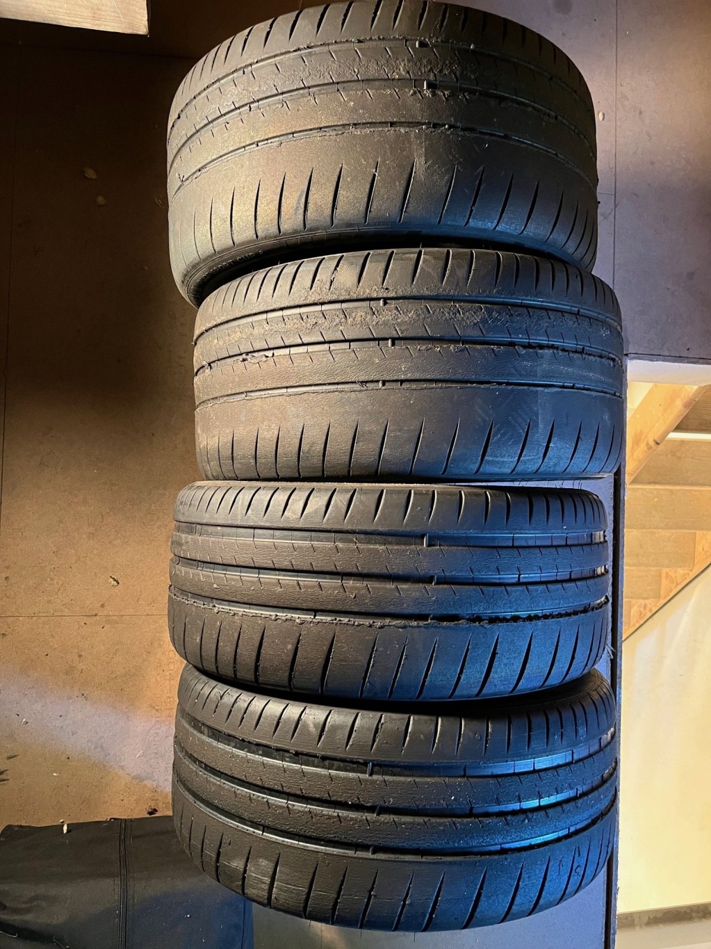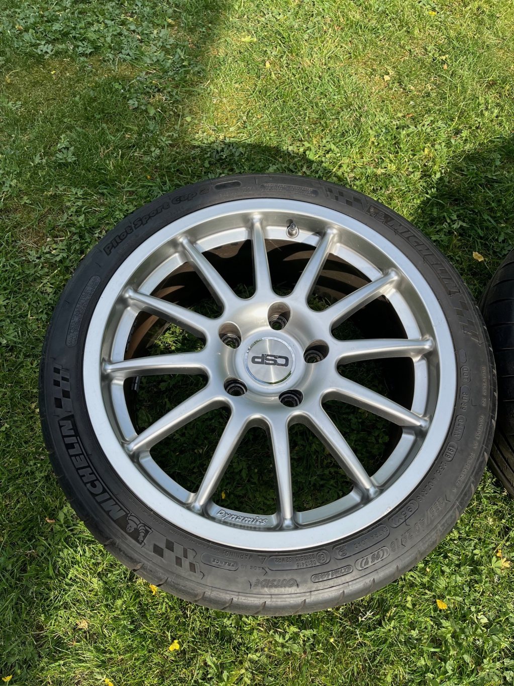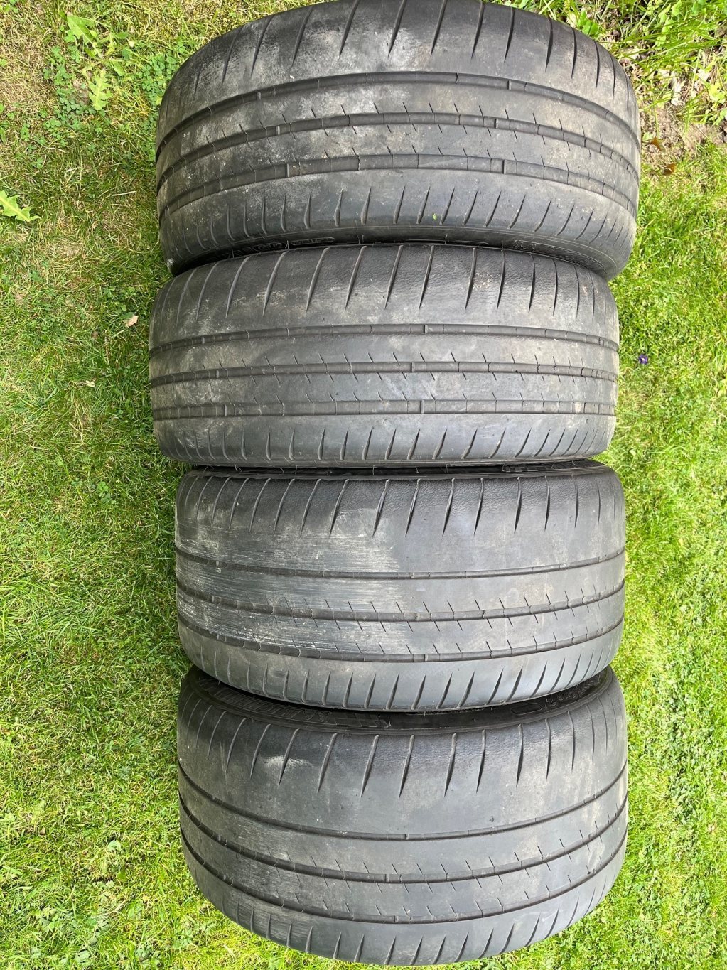 Däcken är Michelin Cup 2 med helt ok mönster, men dom är ganska gamla (-15/-16). Dock goda för 8 min tempo förra året på en gammal 986:a. Dim: 265/35 samt 235/40.