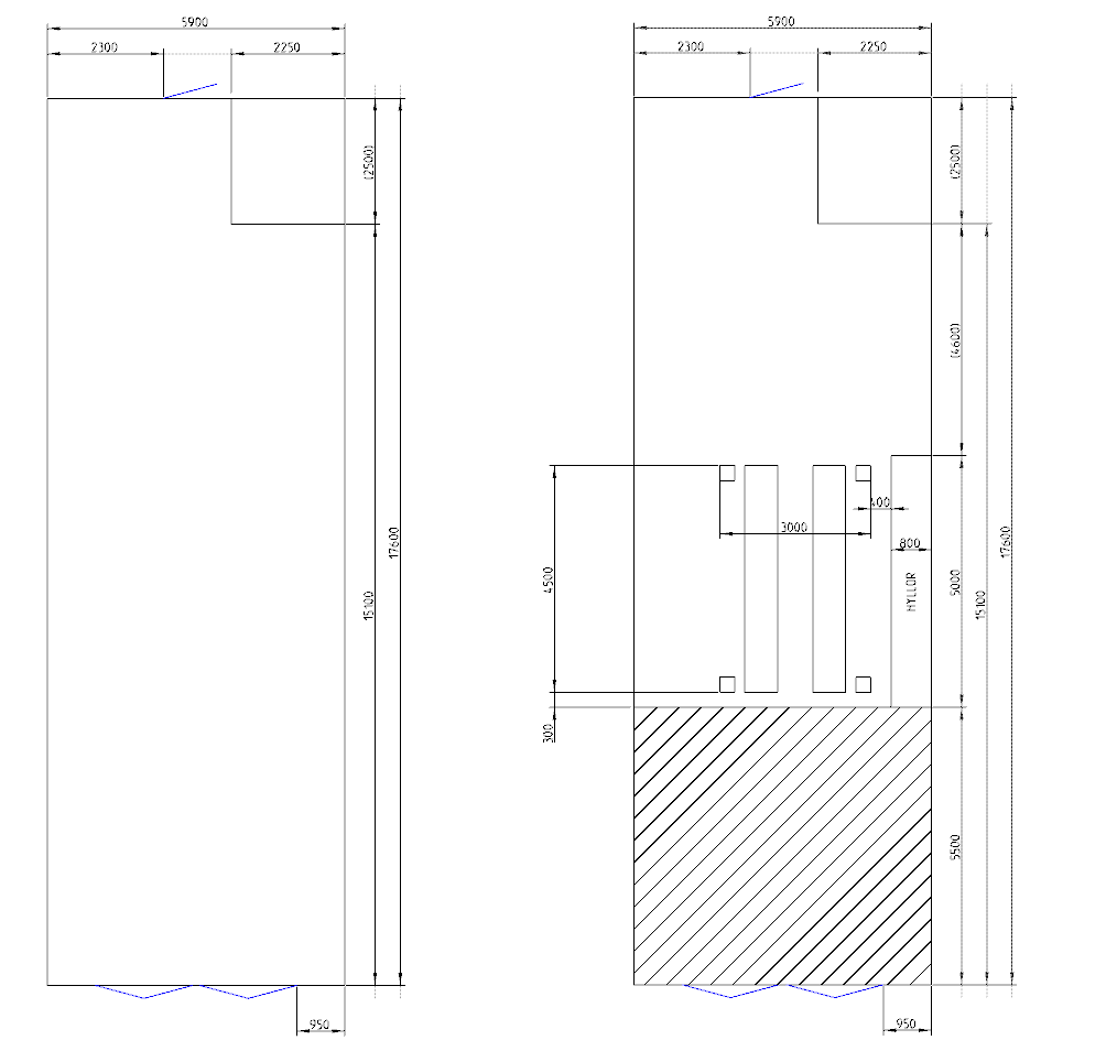 Hade absolut varit trevligt med lite mer plats, men jag får ca 1600-1700 på vänster sida om lyften, vilket ger utrymme för arbetsbänk, skåp eller hyllor längs väggen. Annars blir den ytan outnyttjad. Sen är det bara trångt vid pelarna, mellan pelarna kan man nog få närmre 800. Man kan ju ta bort en hylla där så kan man få en passage in istället för att trycka sig igenom på 400 mm. Passagen till vänster blir kombinerat arbetsområde så man får plats att stå vid ev bord/komma åt skåp. Började rita in lite mer, var skåp, arbetsbänk, maskiner, kompressor ska stå får nog ta och falla på plats när vi börjar ommöbleringen.