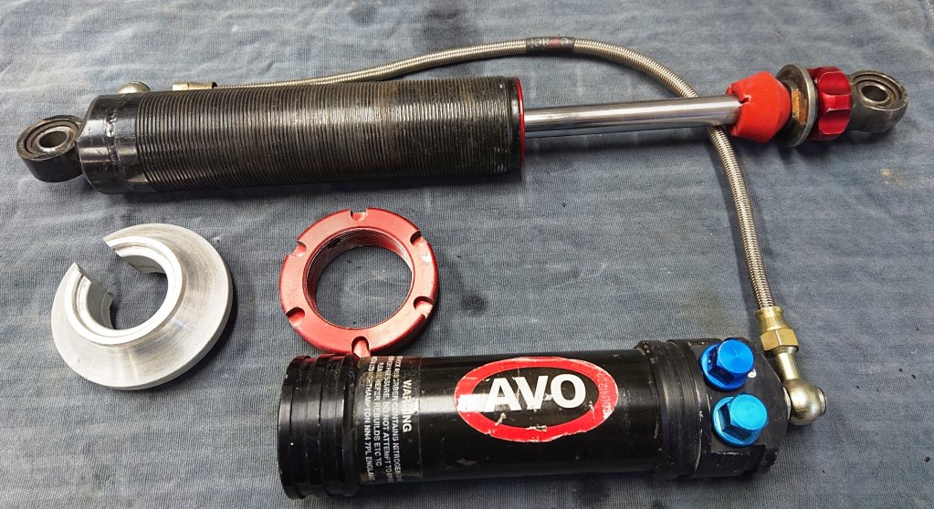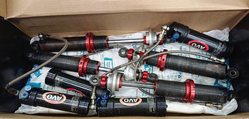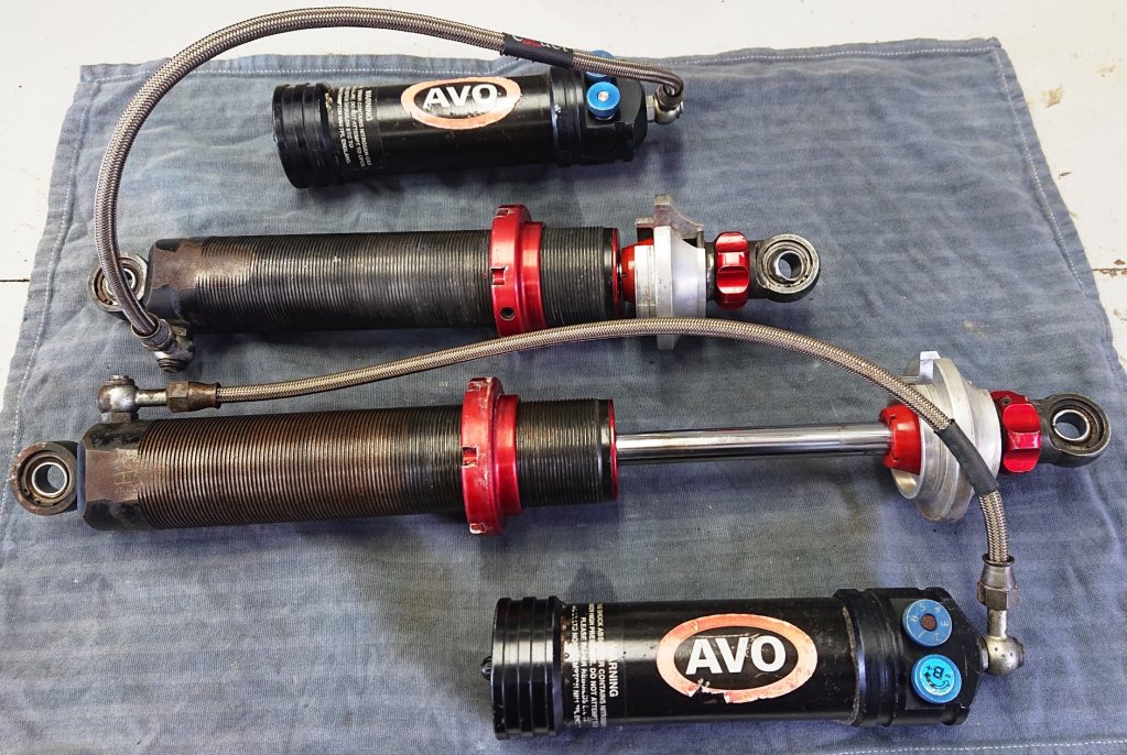 Säljer komplett sätt dämpare inköpta nya från Avo 2013. Har suttit på min Porsche 928 racebil under 6 säsonger innan jag bytade till Öhlins. Är 3-vägs justerbara med rebound och snabb/långsam i bump. Framdämparna i gott skick varav en nyrenoverad och ej monterad sedan dess. Framdämparna har C-C i utdraget läge 420mm med slag 130mm. Bakdämparna ha C-C i utdraget läge 470mm med slag 150mm. Bakdämparna i sämre skick och behöver en översyn. Alla dämparna har länkhuvud i ändarna med 1/2" hål. Dämparna gjorda för 2,25" fjädrar. Pris framdämpare 4000kr/par, bakdämpare 2000kr/par. Alla för 5.000kr.