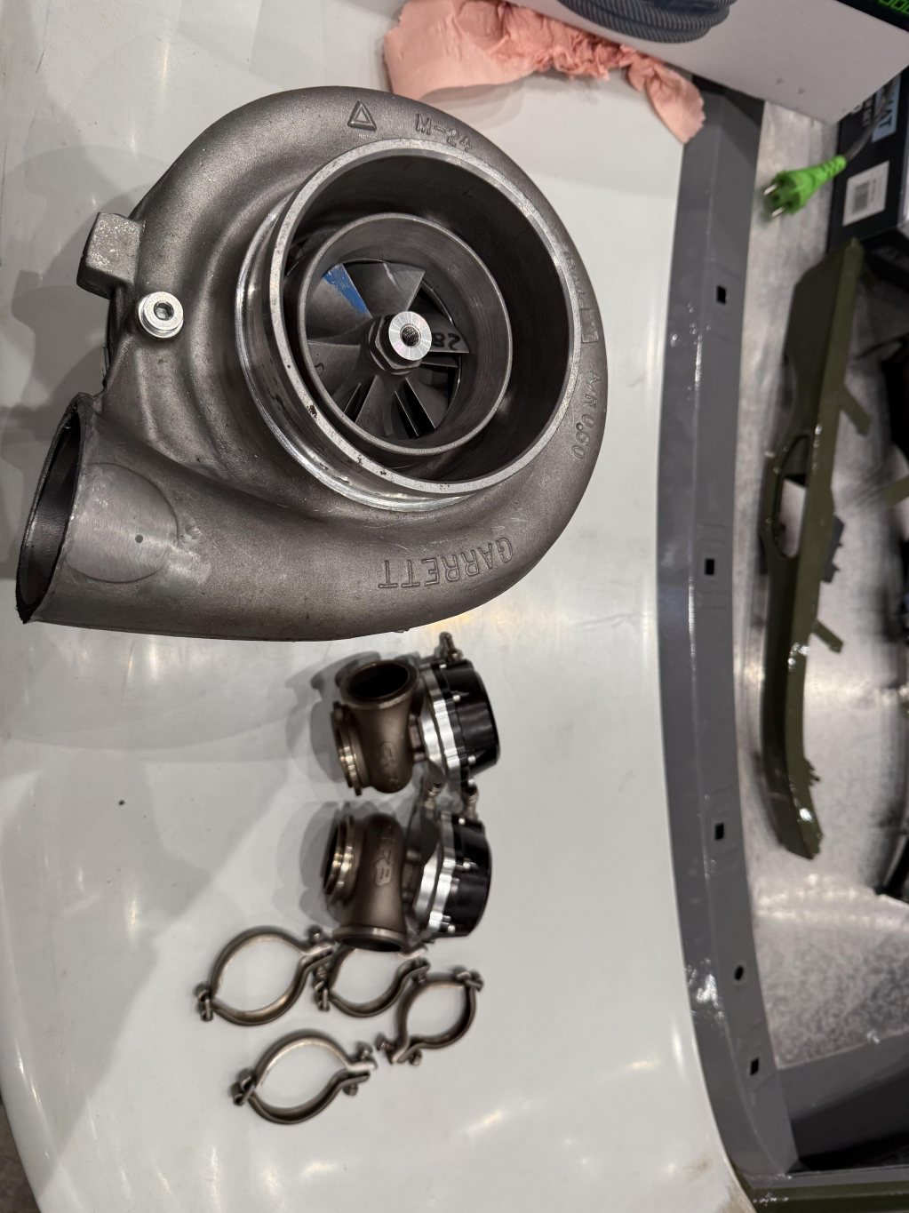 Waste Gates och turbo endast körda i bänk . Waste Gates är köpta på do88 Finns två st . 2500 kr st Turbon är lite oklart vad det är för modell . Men det är en garret och vart lite trång i avgashuset t4 fläns när jag var uppe 700 hk på naven . Detta var på BMW m3 e46 . Den är kulagrad och behöver svetsas en ny anslutning på snäckan då det satt vband som inte fick plats innan . Pris 7000kr Paketpris 10000kr Med vänlig hälsning, Daniel Werner