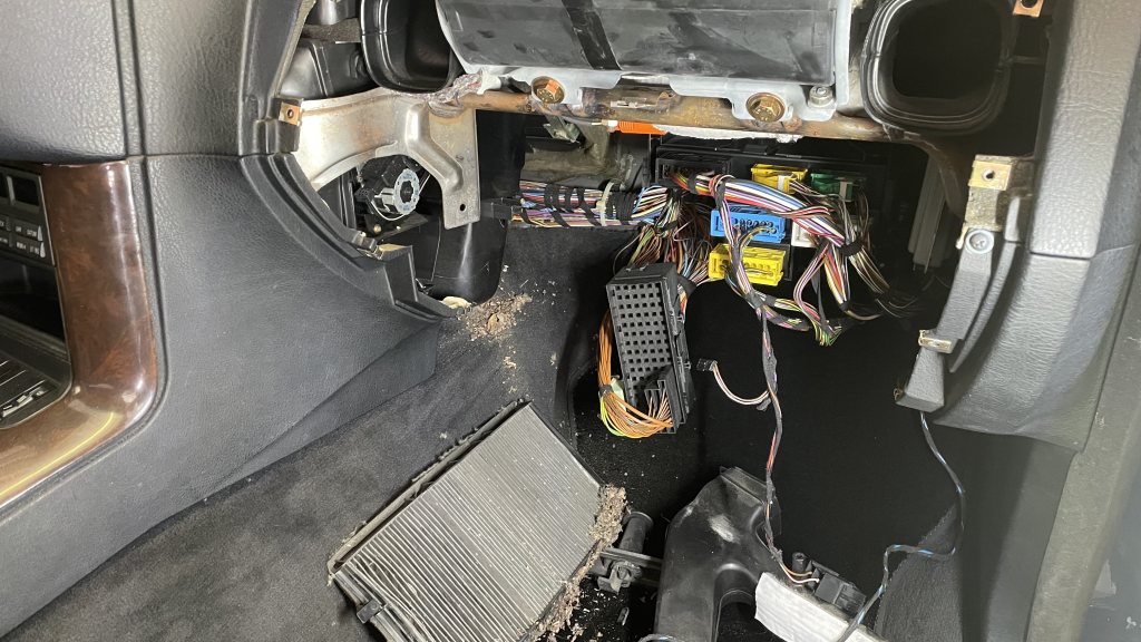 Finliret fortsätter... Kylvätskeläckaget identifierat och åtgärdat. Något extra varv på två olika slangklämmor löste biffen. En satt visserligen jäkligt krångligt till men med lite beslutsamhet och några sköna rivsår på armen senare så var det åtgärdat. Servicen avslutades med bilvärldens i särklass krångligaste kupéfilterbyte. Kan säkert vara anledningen till att filtret troligtvis aldrig bytts... Man börjar med en kåpa i papp/kartong(!) under handskfacket, ovanför där man har fötterna. Sedan ska hela handskfackslådan monteras bort, en modul med ventilation över handskfacket, en luftkanal samt en knutpunkt med kablage. Filtret sitter sedan inne i mittkonsolen bakom en panel så man tvingas jobba blint. Filtret är förknäckt på två ställen så man måste vika det för att få ut det. När man väl har filtret i handen har 29 års samlat bös trillat bort och landat på mattan... Ansvarig konstruktör borde få sig en avhyvling!