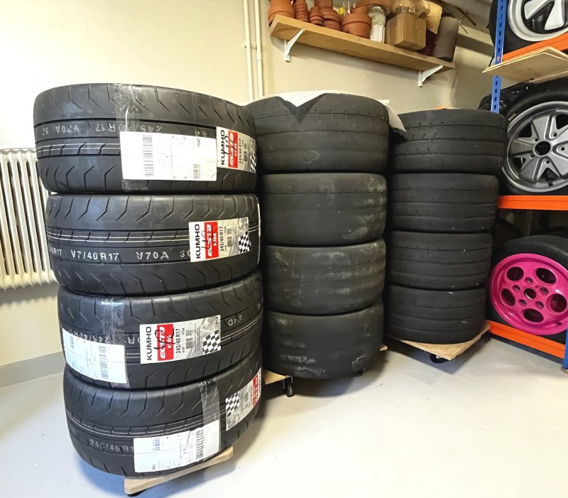 Jag har börjat proviantera lite, först däck. Det blir att säga adjö till första omgången med Yokohama A052 255/40x17 i mitten på bilden, de är verkligen att betrakta som slutkörda även för en smålänning. De har bara gått 2 trackdays och sedan en mängd superstage och körning med sportvagnsklubbarna på flygfältsbanor som fullkomligen käkar upp däck. Därför har jag haft en omgång till som inte körs på flygfält, lite till höger i bild. Nu blir de nedgraderade till nöta-nöta-däck och kanske nån vanlig trackday. Istället blir det Kumho K61 245/40x17 på 9"-fälgarna, jag hoppas de är åtminstone några mm smalare än A052 så de inte rubbar mot bromskylningen. Jag hade Kumho K61 på 924:an och de imponerade redan på uppvärmningen, Threadwear 50 och kändes som att köra på klistrad bana. _________________ Bengt Gson Nilsson GR Yaris -21 ...gottgry 924S -86 ...pcsr #924 911 -74 ...gul @lagteknik på instagram |