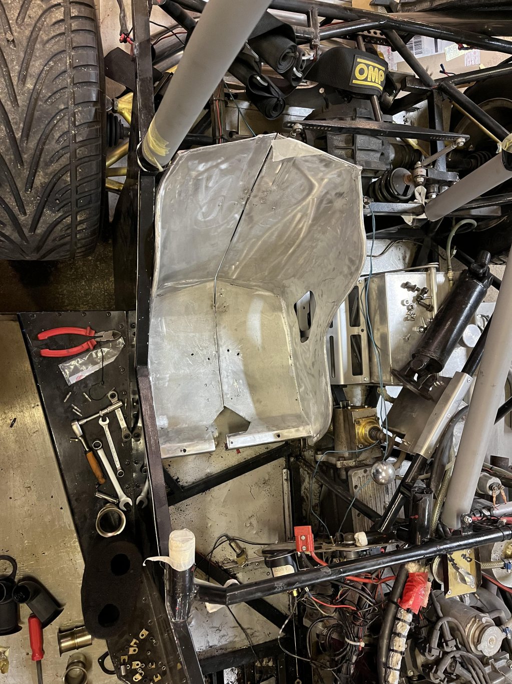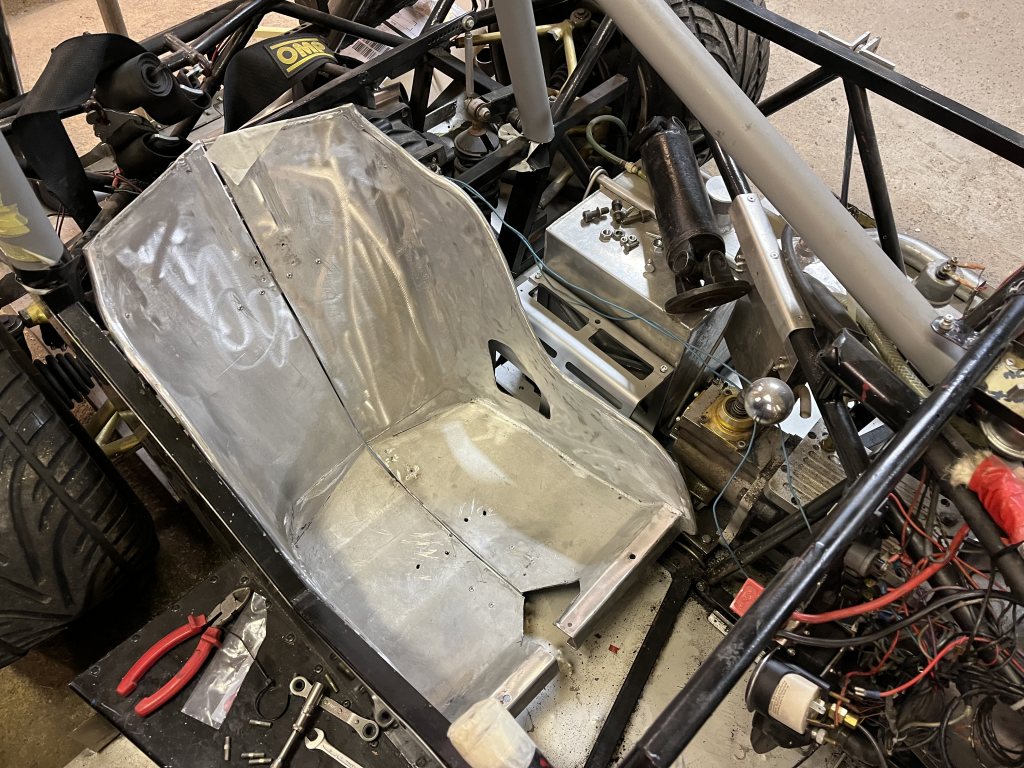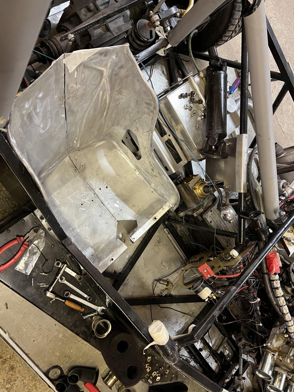 Nu kommer vi till den riktigt läskiga delen. Efter att ha hittat en aluminiumstol på dragracingmarknad har jag smalnat av den och använt som prototyp. Det är precis så bred stol som jag får plats med, och ungefär så smal stol som jag får plats i, så med den tog jag hjälp av en vän och försökte hitta lösningar för att få plats i bilen. Jag kröp ned (det finns det inga bilder på, tack gode gud) och min vän Marcus hjälpte mig att mocka upp saker och ta foton för att förstå vad jag behöver göra. Längdmässigt verkar det se bra ut för pedalstället, och jag behöver inte bredda fotutrymmet vad det verkar. Det jag trodde var ramen som min gasfot fastnade på, visade sig vara en läpp för att montera förarutrymmesplåtarna, så den kan tas bort. Däremot är det uppenbart att jag behöver en annan lösning för oljefiltret.