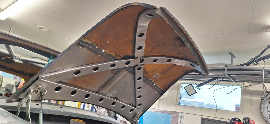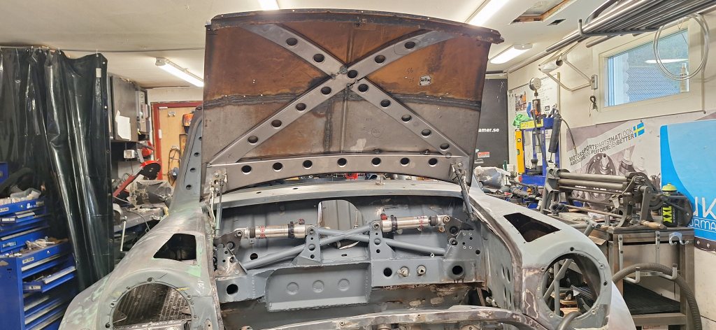 Huven måste bli duktigt styv när detta svetsats klart. Tänker mig dock att svetsningen måste gå VÄLDIGT lugnt och stilla med massor av avsvalning för att plåten ovanför inte skall tok-slå sig, eller att hela huven blir skev?