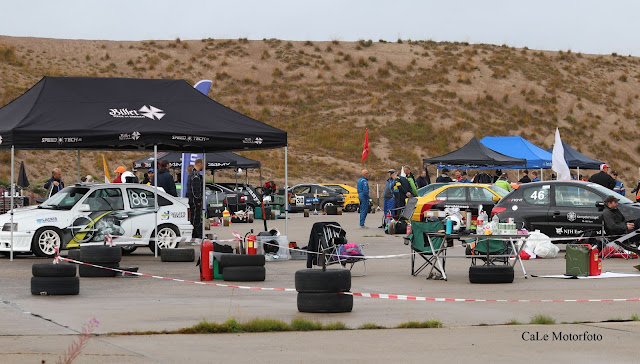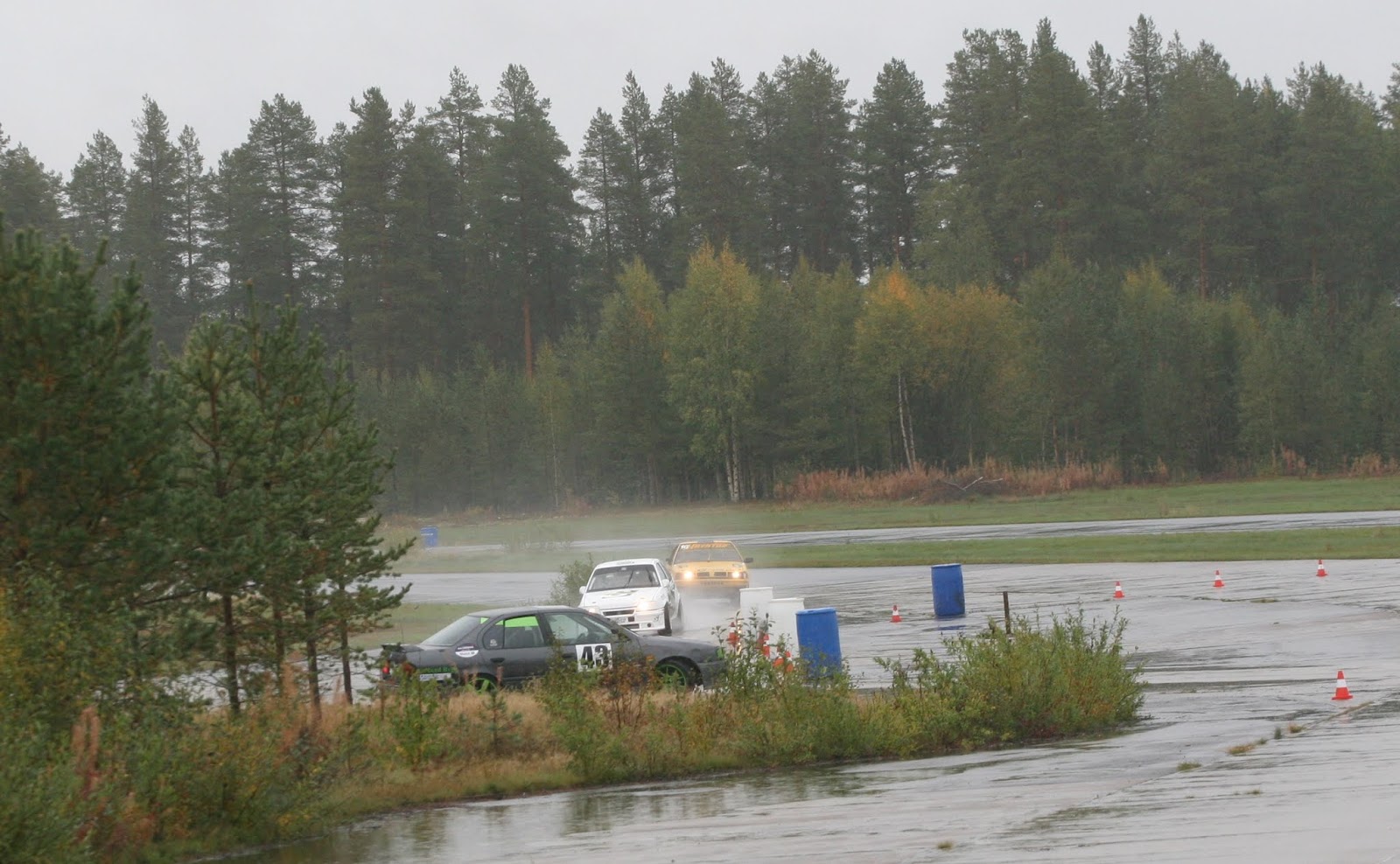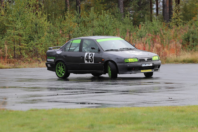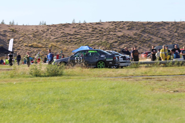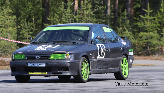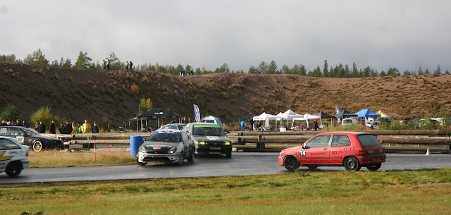 Jag kunde precis missa Skelleftereklams Kadett som jag just släppt förbi, men det blev en tur på gräset. Med ordentlig pumpning så fanns det bromsar men inte så mycket...så det blev till att ta det lite försiktigt runt banan. Nu gick det inte så fantastisk mycket långsammare än när det var blött så vi lyckades ändå hålla undan.