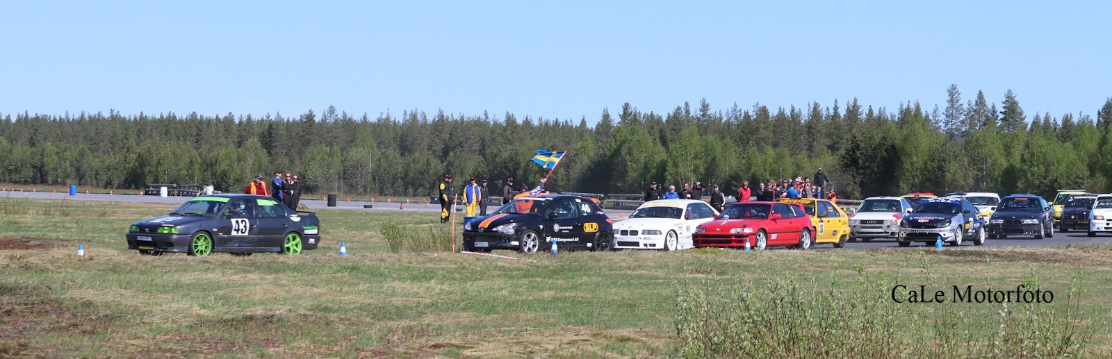 En testdag veckan innan rejs gav att det mesta verkade funka tillräckligt bra för att bara köra på. I första rejset för säsongen lottas startordningen och vi hade turen att hamna först :-) Bredvid oss hade vi NJH Entreprenads (tidigare Kompetenslaget) Peugeot 206 och i ledet bakom Släp in the Face (320 e36) samt Team Tidy Powersports (tidigare Team Burén) i deras Civix CRX VTEC. Civicen är ny för i år, en bil som klassar in som 5000-kronorsbil tack vare att modellen körts i serien tidigare år av ett annat team. Grym potential i den lätta bilen!