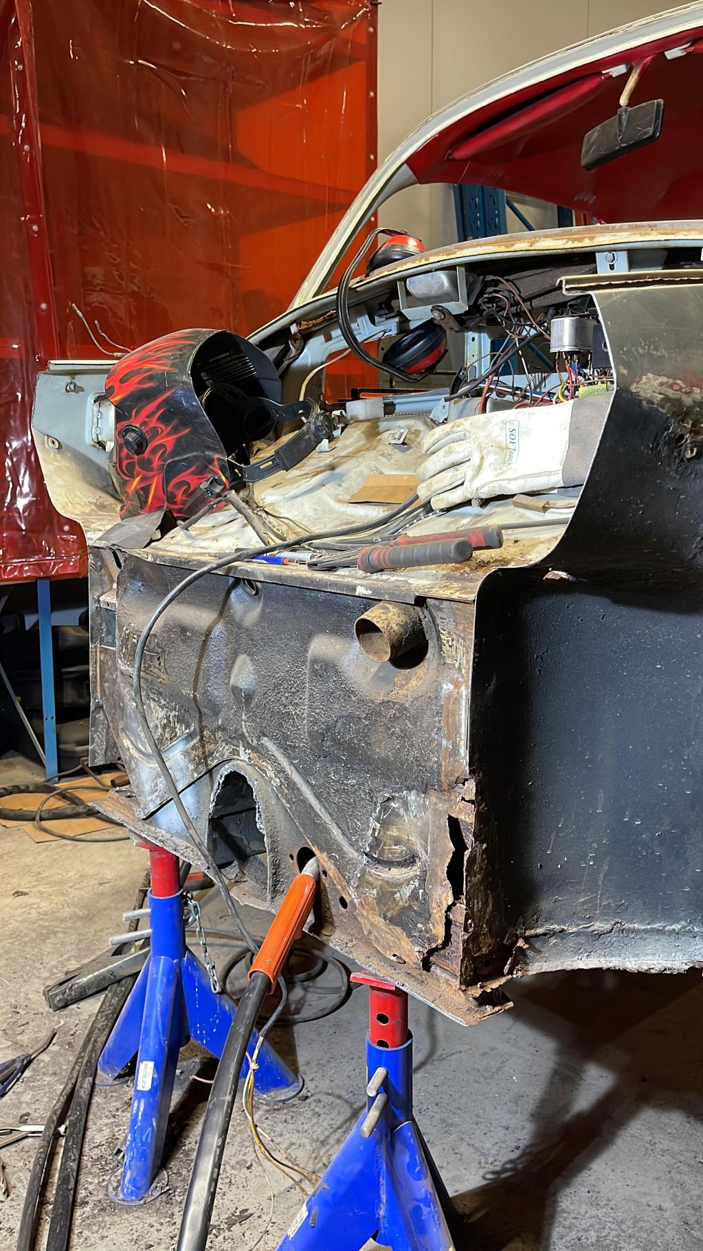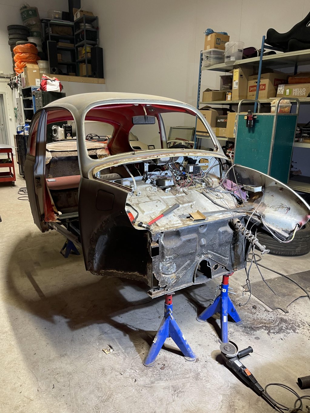 Låda, drivaxlar, och troligen svänghjul kommer bli till salu. Det dyker upp motorer lite då och då, främst från automater Nu har jag äntligen varit i garaget igen. Jag har börjat staga upp karossen för att byta värmekanalerna (trösklar kanske man kan kalla dem, för de som haft oturen att inte skruva bubbla). Nästa steg är att få upp karossen från golvet. Måste bygga någon typ av ställning men jag vet inte riktigt hur jag ska göra just nu. Hade varit guld med en vagga, men känns inte riktigt värt det