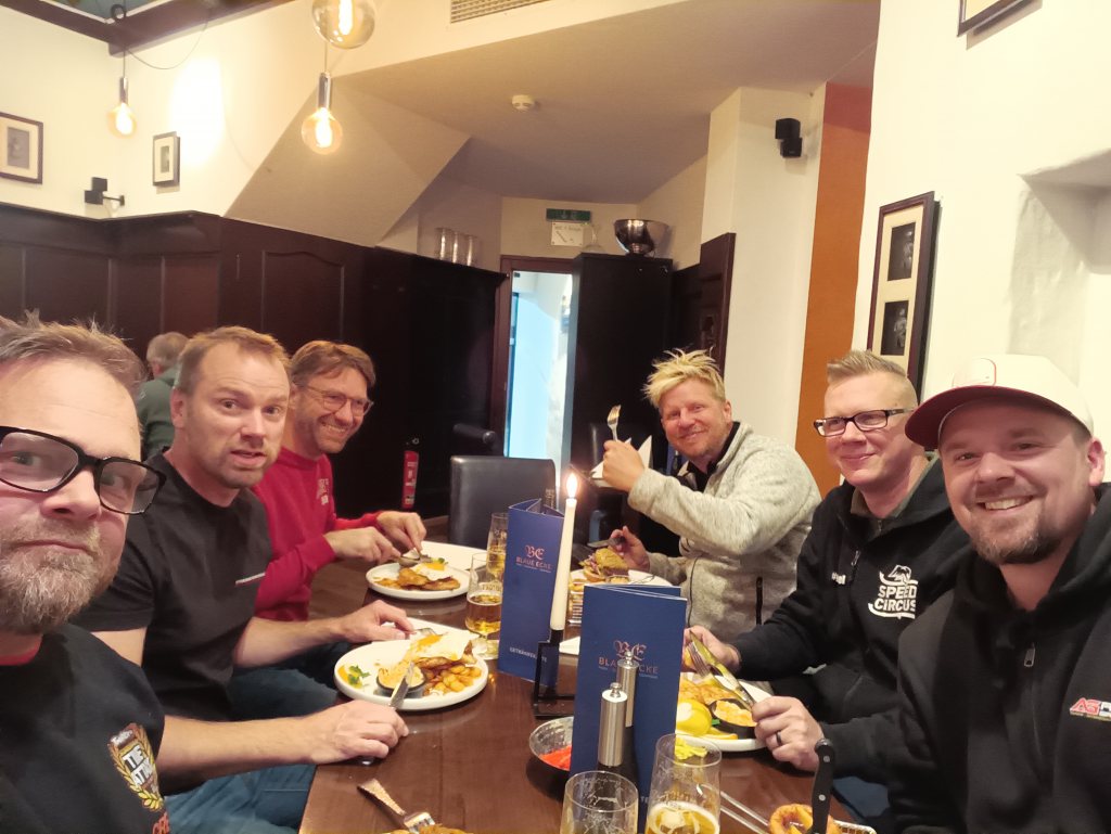 Sen fick vi besked om att NLS drog ut på tiden och vi skulle inte få våra pitboxar förren 20:00 Vilket gjorde att vi bokade bord på Pistenklause kl21. Det tog inte lång till innan Jarosinski ville vara med, så då ringde vi och ändrade bokningen så han fick vara med... Fast sen fick vi ringa igen, för då flyttades tiden fram till 21:30 för pitbox. Så vi käkade kl 19. Sen började jag jaga Ranald för att hämta bilen. Han svarade inte, för han satt på Bio. Här någonstans fick jag panik på riktigt. kl var 21 och jag hade ingen plan för att få tag i min bil. Dock släppte detta på typ 4min när han hörde av sig och öppnade grinden, så vi kom åt bilen. Återigen är han helt fantastisk och löser allt. Vi hämtar bilen och drar upp till banan. Bra med kaos när alla ska in samtidigt som alla NLS ska ut. Det var rätt bisarrt att se när de kör GT3-R på gatan. De har nämligen tillstånd att köra racerbilarna på gata från banan och ner till industriområdet borta vid långrakan. Skitfrånt.... Vi mötte även 2 bilar med gult lyse. Vi garvar och säger, det skulle kunna vara mustangerna. Skapligt paff vi blev när det faktiskt VAR mustangerna. Trots folk överallt, så klarade de sig till teamet utan olyckor. Sjukt