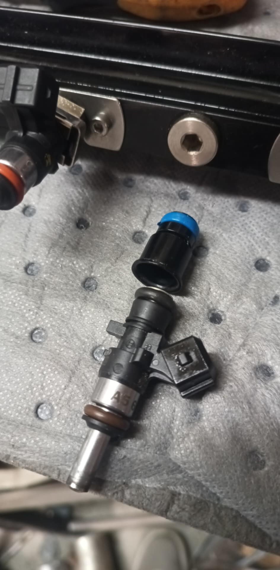 Men... det gnagde mig en del med motorn så klart. Nu efter all besvikelse så började ju ADHDn krypa på lite. Så jag åkte ner och började riva lite. Kollade bränslefilter. Jag tyckte det var långsökt, eftersom trycket var bra, men det är tydligen så att det kan hända säger de flesta mappare. Filter var ok. Jag testade flödet i ledningarna och det såg bra ut. Sen sa Nader på Autogruppen åt mig att testa en pump i taget för att se om de drar olika mycket ström eller bygger olika mycket tryck. Det såg bra ut allt ihop. Sen frågade han om spridar filtren... Här någonstans så kändes det som att någon släppte ett piano i huvudet på mig. Jag byter ju spridare varje år och skickar den andra uppsättningen på service (jag har 2) Detta för att alltid ha fräsha spridare. Jag kör Bosch Motorsport spridare. De har i 3 delar. En hylsa som sitter i insuget. Mittendelen med munstycke och själva ventilen och en övre del som sitter i railen med låsblecket med 2 insex skruv i. Sist när jag bytte så orkade jag förmodligen inte skruva loss över hylsan, utan bytte bara själva spridaren. Den sitter ju bara med ett sånt där fjädrande clips. (bilder kommer i nästa inlägg) I den övre hylsan sitter dock det lilla spridarefiltret. Dessa var rätt tråkiga nu. Jag hade ju nya som låg, så jag provade att blåsa i dessa och i de som satt på bilen. Jag kände en tydlig skillnad i flöde. Så där hade jag hittat varför den gick tunt på Ringen.