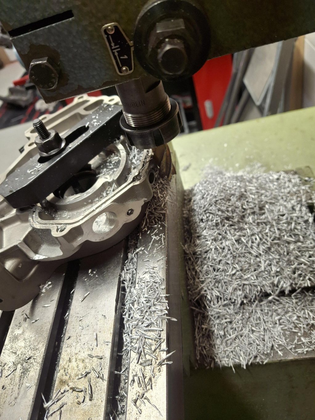 Efter att oem tråget var av, så plockade jag av alla kåpor och kamrem (som byttes till en färsk) osv för att komma åt oljepumpen. Denna behövde spännas upp i fräsen och rensas för frigång. Så numer är oljepumpen en främre vevaxeltätning Mycket spån blir det..