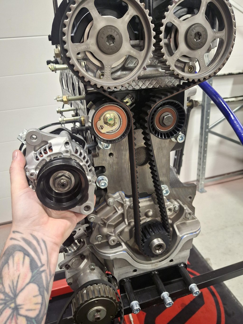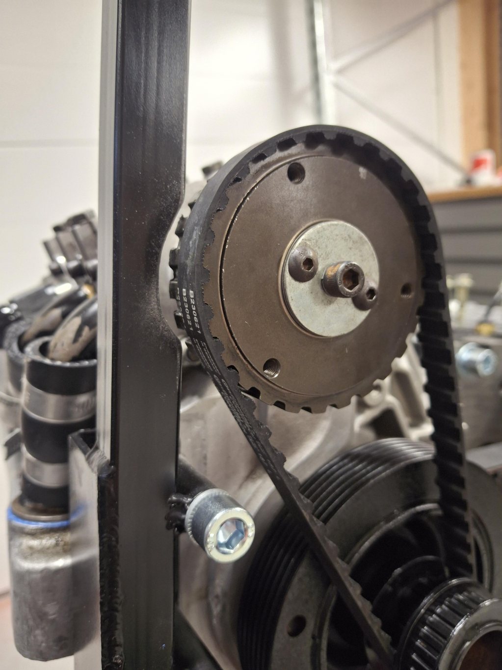 Ger 60A vid 6000rpm. Har även till denna beställt nedre/övre fäste från proforger, och helt plötsligt kommer denna bli enda förbrukaren på multiremmen, generatorn kommer agera spännare, blir 2 uniballs och "vantskruv". Generatorvarvtalen med remskivorna blev ca 1150rpm vid 700 samt 11800 vid 7500, tvivelaktig laddning på tomgång men annars blir varvtalet så högt vid fullvarv. Generatorn vägde 2800gr, säg 3kg med fästen. Sparade 1200gr på nedre remskivan och sparar ca 1kg på att gå till EWP80 pump, så det känns rätt okej, speciellt när man får både laddning, effektivare pump och världens alla möjligheter till styrning Oljetråget har fått nya slangar och pumpen schimsad bättre för remspänningen. Svarvade även av gamla vattenpumpsdrivningen från remskivan, denna behöver dock lite svets och färg. Apropå olja, blev överlycklig när det satt en "modine" vatten/oljekyl på blocket när jag packade upp motorn. Tyvärr fick inte denna plats vid filtret tillsammans med torrsumpen. Tanken är att ha den monterad vid oljefilteradaptern som kommer få byta plats, tillsammans med både oljetank och expkärl.