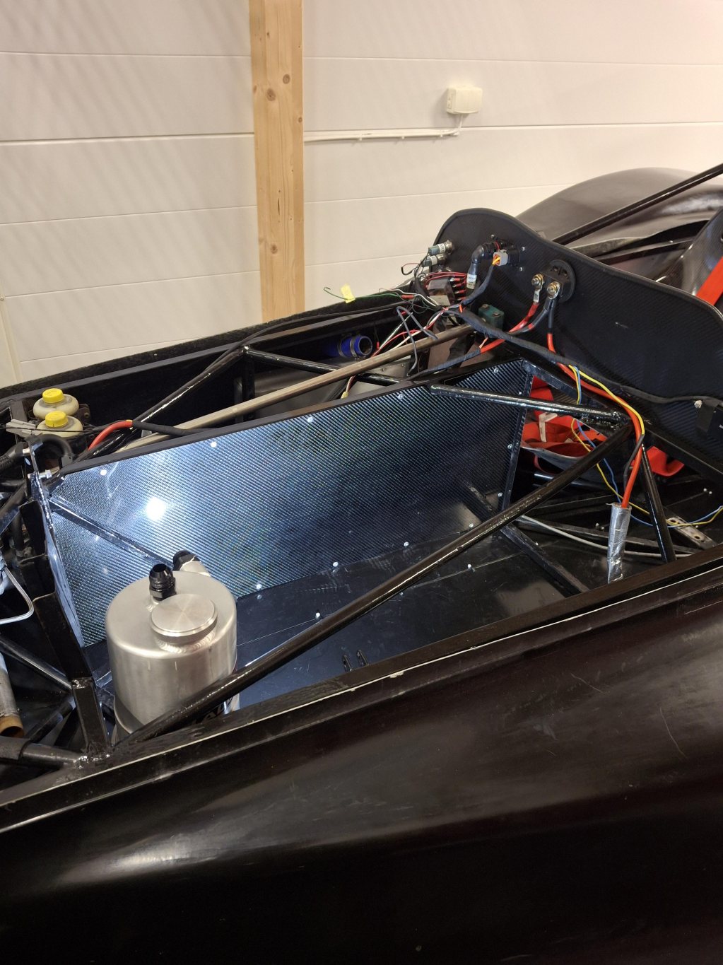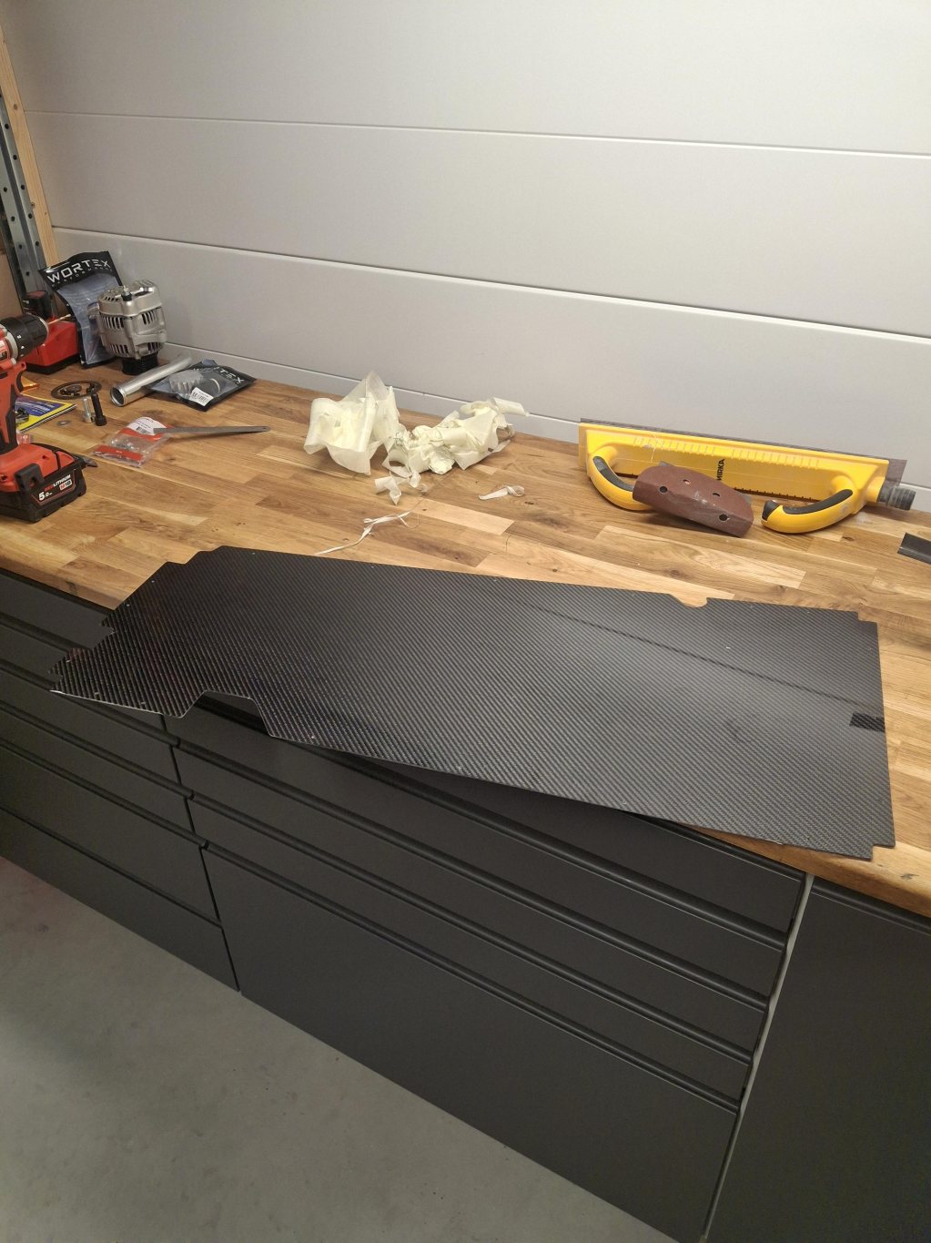 Vilket betydde att jag behövde påbörja nya inklädnaden av benutrymmet. 1.5mm kolfiber mallades och sågades till. Några tankevurpor så inte F1 nivå, men bättre än lapptäcket innan