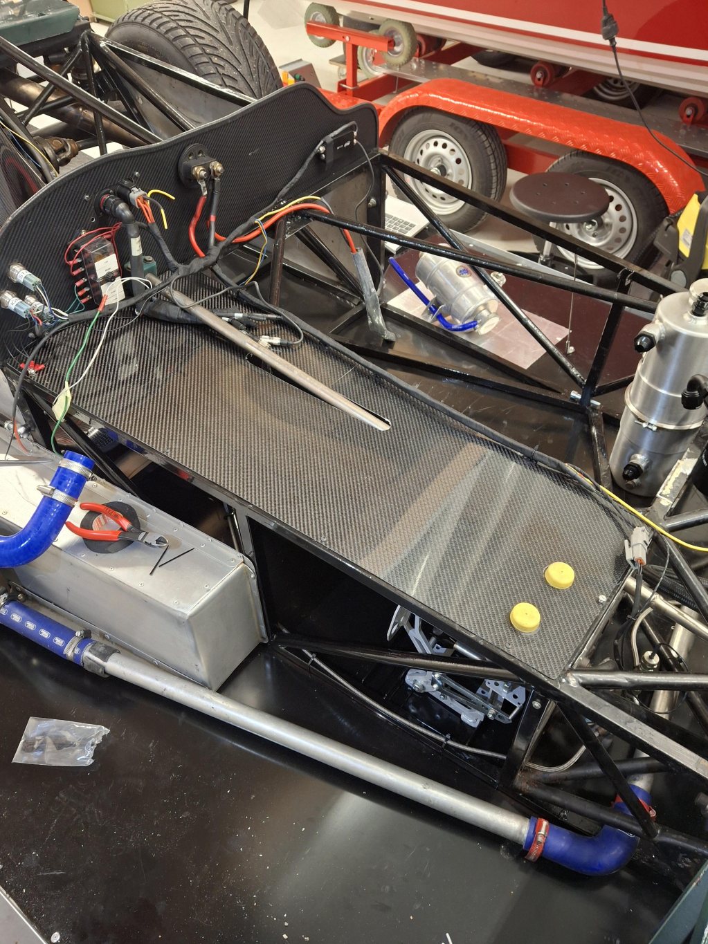 Pedalstället monterat, tidigare satt allt i en tunn plåt mellan ramrören, lite flexigt. Körde 2st (tunga) 25x3 vinkeljärn. Skall till ett 3e framför pedalerna som hälstöd, men hann inte så långt. Den uppmärksamme ser även att jag påbörjat att ta bort aluplåten ovan och lagt igen hål, skall bli kolfiber här strax. Hade kunnat flyttat cylindrarna och skurit bort mer plåt/vikt, men jag orkar inte iår