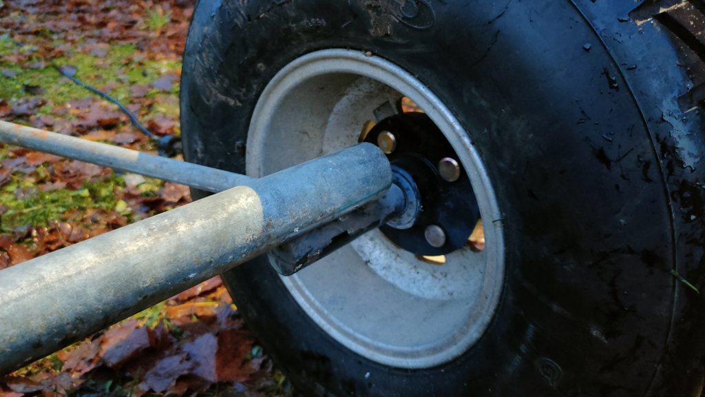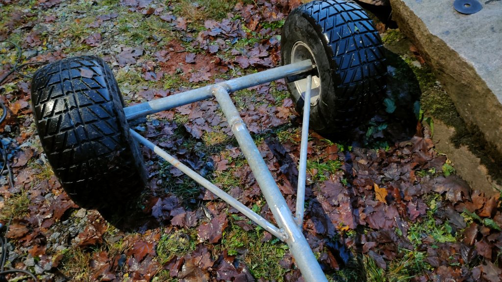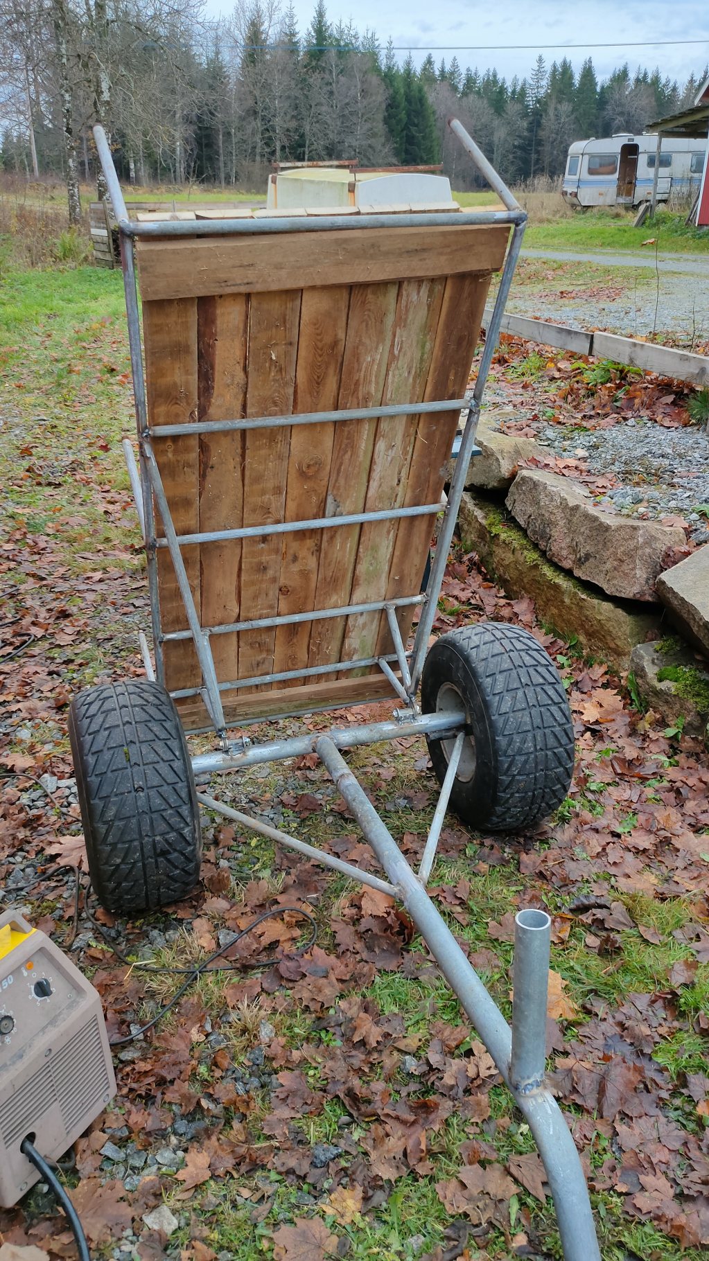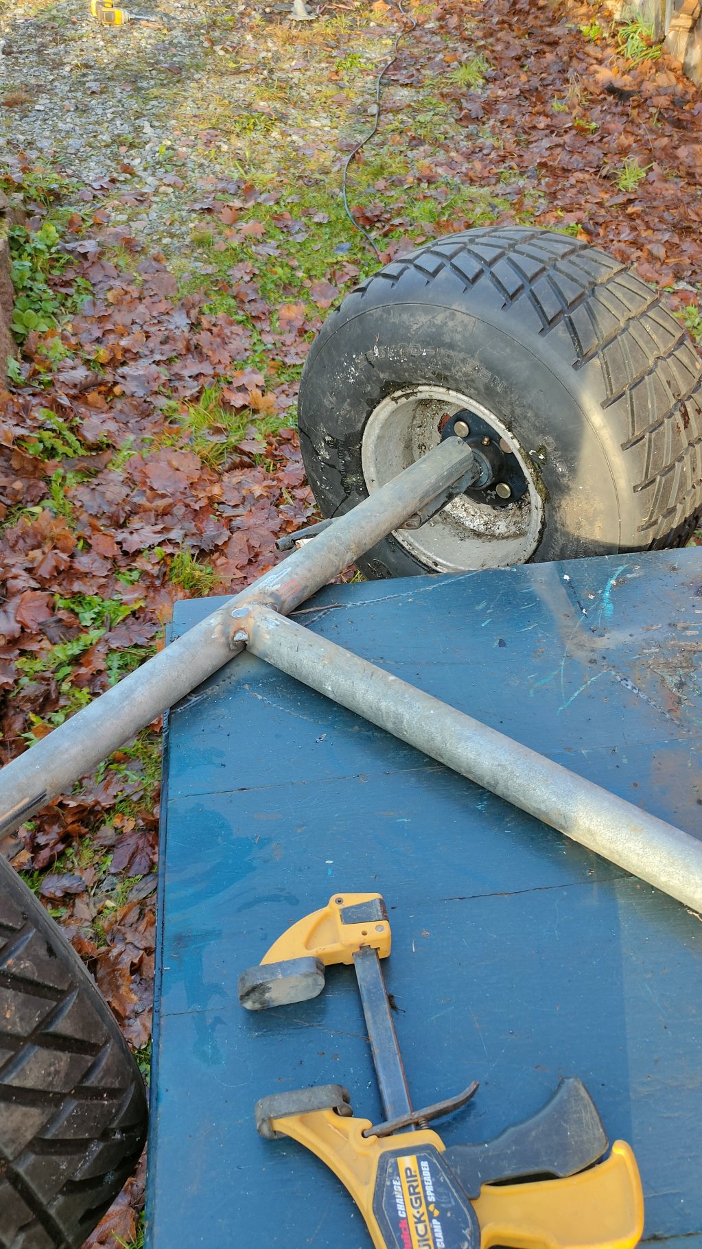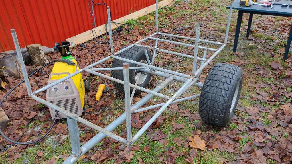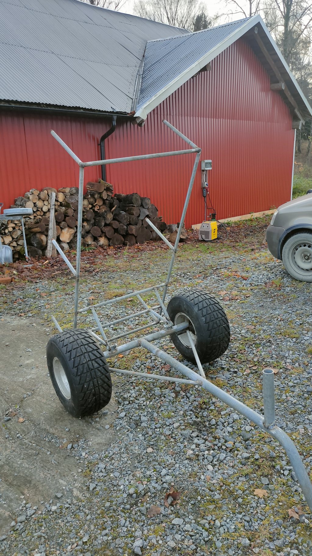Ett par överblivna fyrhjulingshjul, två axeltappar från Biltema, överblivna rör från ladan, några meter svetstråd och några kapskivor senare.