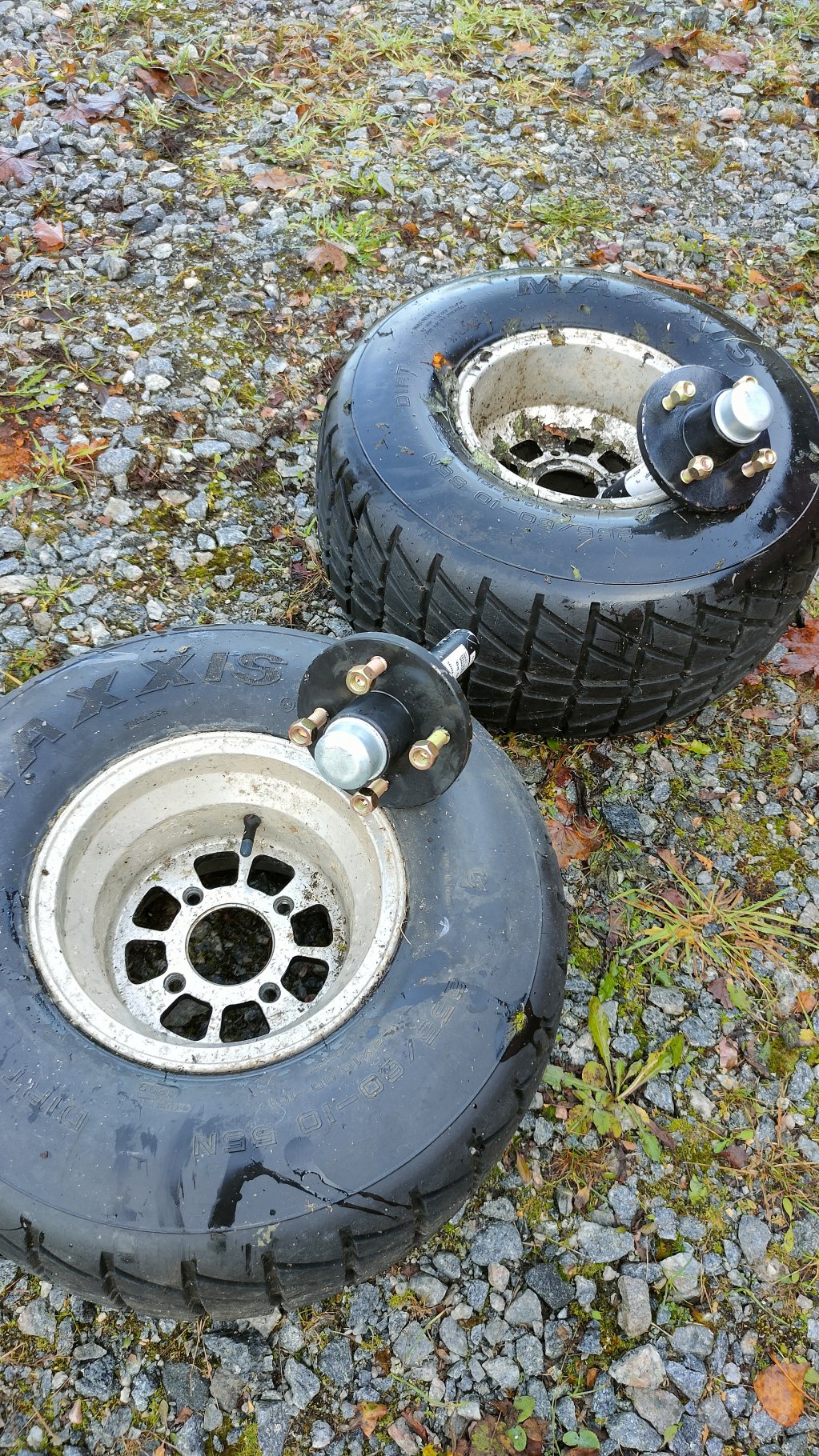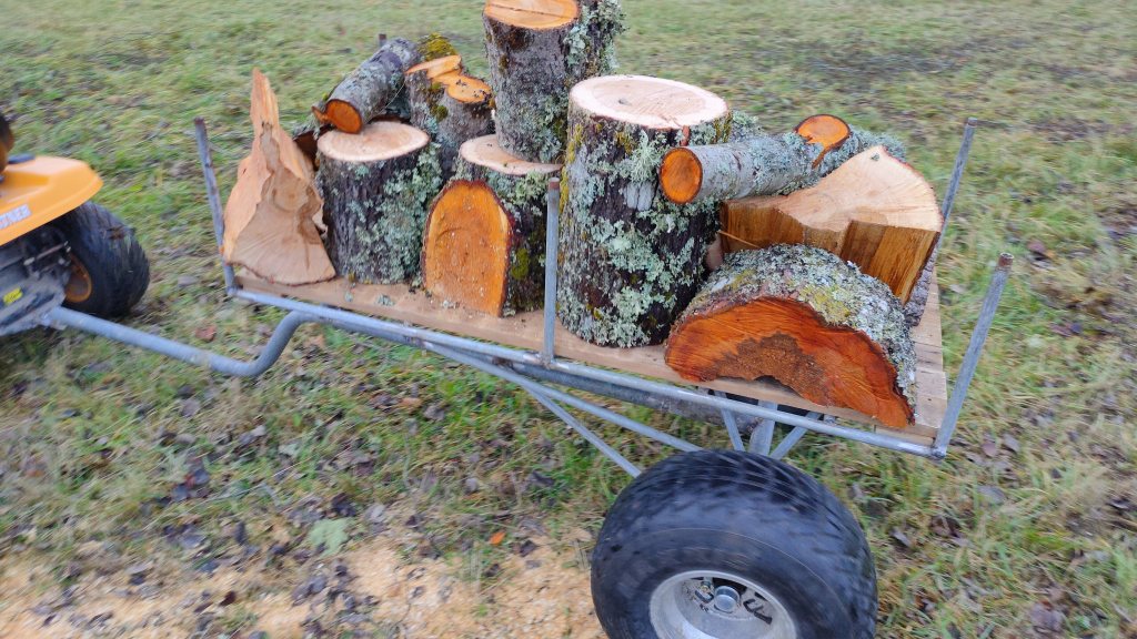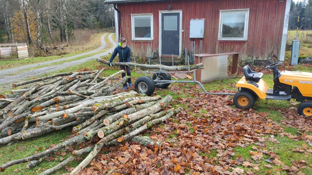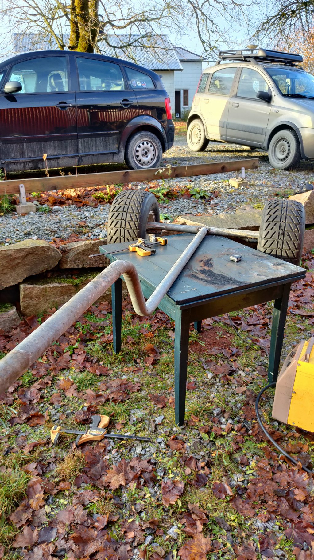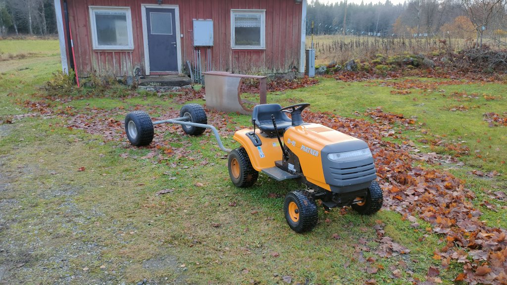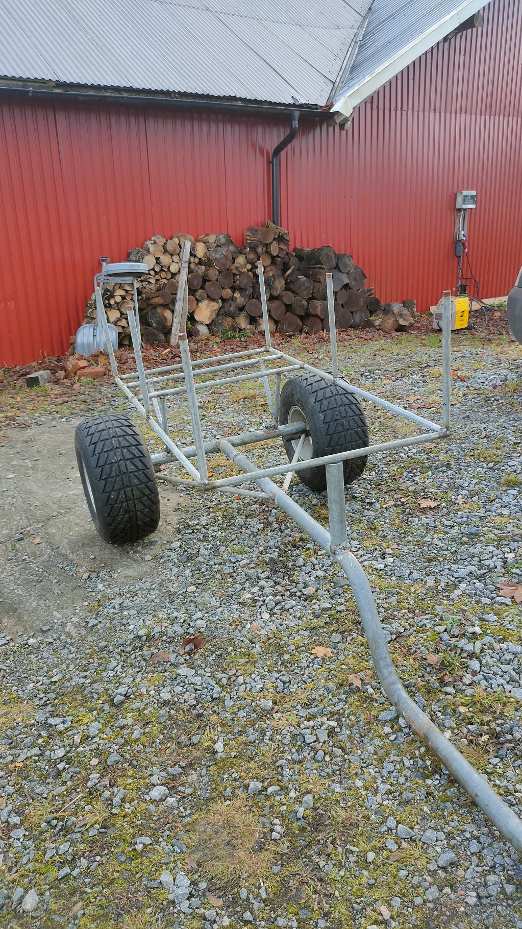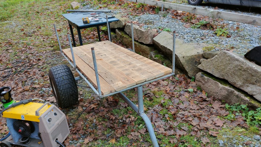 Ett par överblivna fyrhjulingshjul, två axeltappar från Biltema, överblivna rör från ladan, några meter svetstråd och några kapskivor senare.