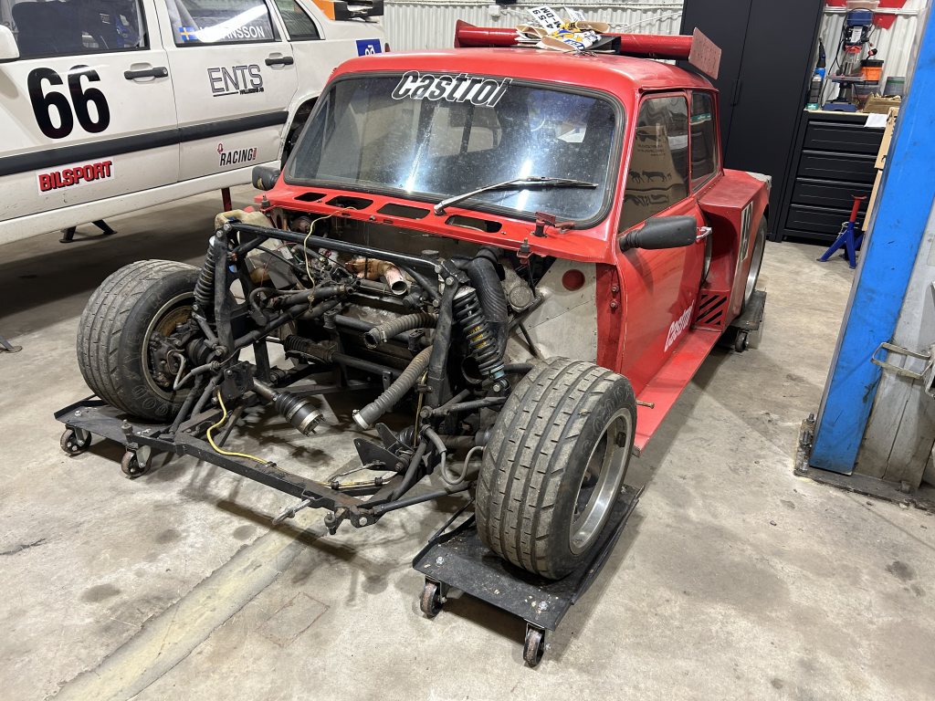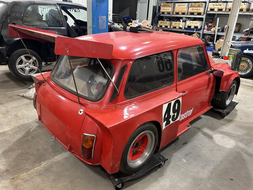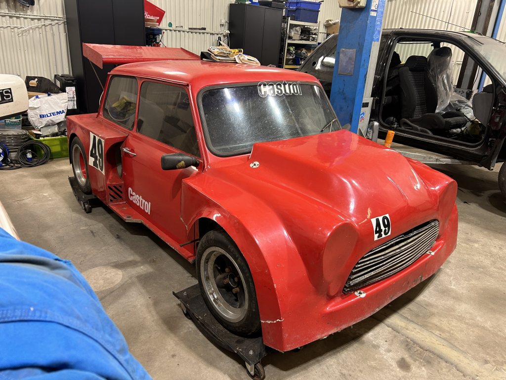 Det är då en Austin Mini 73'a (har jag för mig) papper på den finns Rejält ombyggd för racing för lääääääänge sedan, den gick tävling senast cirka 88-89. Gick i SSK Seriens Castrol Cup bland annat, vart bilen kommer ifrån från början råder det dock delade meningar om men från 83- har jag koll på bilens historia. Förr gick den bland annat med split weber