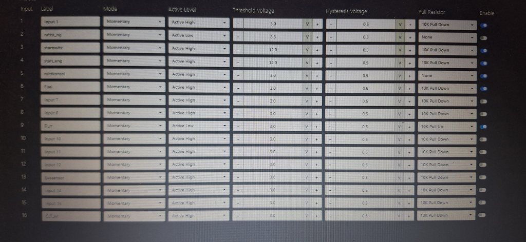 Har som tidigare skrovit en variant av maxxecus switch decoder instalerst . En för blinkersspak å en för mittkonsoll . Blir även en på värmepaket å en för dörrbrytare . Dem e smidiga för som ni ser så kan man bara kolla volttalet på varje kombo av knappar trycka å så får man prutta in lite logic . Hardwire e grymma på det sättet . En helt blank tavla . Och eftersom alla olika volttal ligger med som OR argument så kan du trycka hur du vill den funktion du vill ha är aktiv ändå . För å få lite hysteres så har man även AND function säg att hazzard ger 4,5v på ingången . Då sätter man if input >4,1 and <5,1 _________________ Markus Schneberger Kommentera gärna Austin mini 2,8 AWD https://rejsa.nu/forum/viewtopic.php?t=108448 Leon Cupra 2016 |