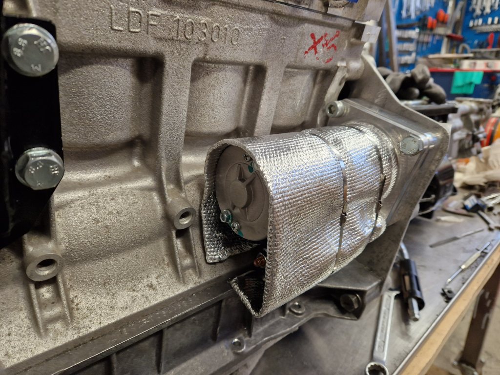 Eftersom startmotorn sitter placerad under grenröret på motorn så har jag försökt skydda den under ett värmeskydd. Men eftersom jag dessutom vill skydda kylarslangarna som ligger ovanför grenröret har jag ett värmeskydd över också. Mina funderingar just nu är om detta kan göra att det ändå blir en liten ugn för startmotorn.