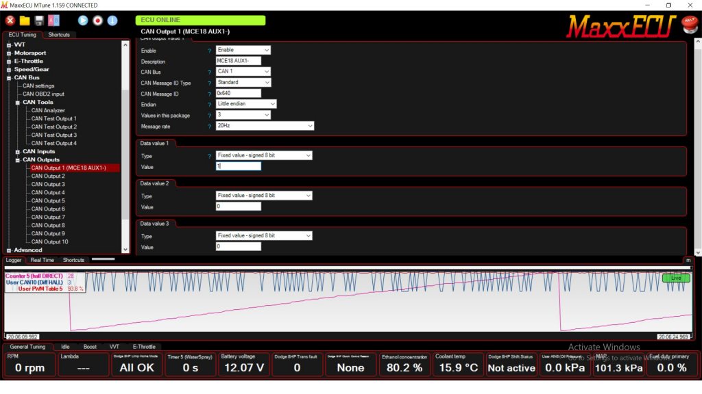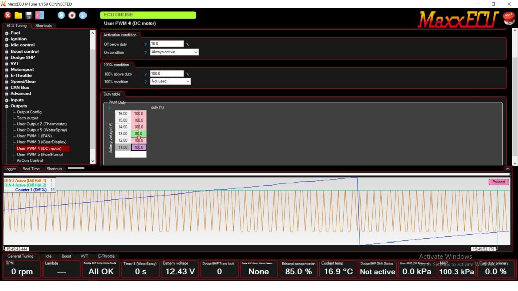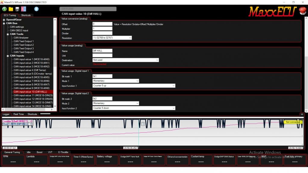 Jag provade istället använda 2 digitalingångar direkt på maxxecu och det fungerade klockrent direkt. väldigt snygg och korrekt pulståg på både kanalerna. Det blir en del extra kabeldragning från baktill på bilen men hellre det än en dålig funktion.