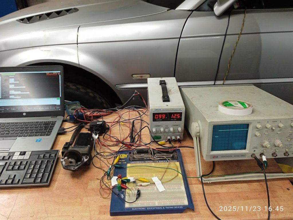 Rotationsriktningen får man genom dom två hallgivarna är monterade 90 axelgrader olika. Så pulserna från dom kommer lite förskjutna. Om hallgivare A puls kommer först roterar motoraxeln medurs, och är B först är det moturs. Det är det som IC kretsen sedan tolkar. En quadrature decoder. Utsignalen från IC kretsen till maxxecu är på två kanaler/kablar med pulser. En för vardera rotationsriktning. Frekvensen på pulserna anger hur fort axeln roterar. bilden visar signalen direkt från dom två hallgivarna.