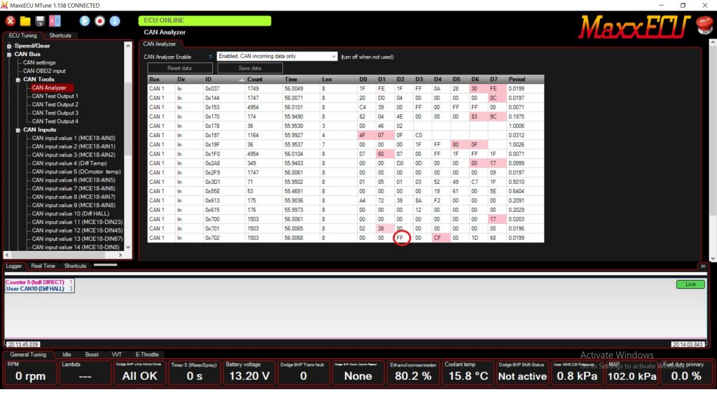 Korrekt. Från dekodern(IC kretsen) går den som vanlig 0-5Volt puls till en digitalingång på CanChecked burken. Canchecked är ansluten till bilens vanliga canbuss. Den skickar från basadress 0x700. Digital ingång 1 och 2 som jag använder för Hall givarna finns på 0x702 Sedan får man maska ut bit 1 och bit 2 ur andra "byten" i D2, den inom röda ringen i bilden nedan. Se föregående bild. Bit 1 skickar pulser för ena rotationsriktningen och bit2 för den andra riktningen. Båda triggar en gemensam räknare 0-100 som räknar upp och ner för hur mycket DC motorn har roterat och då också anger hur mycket diffen är åtspänd för tillfället.