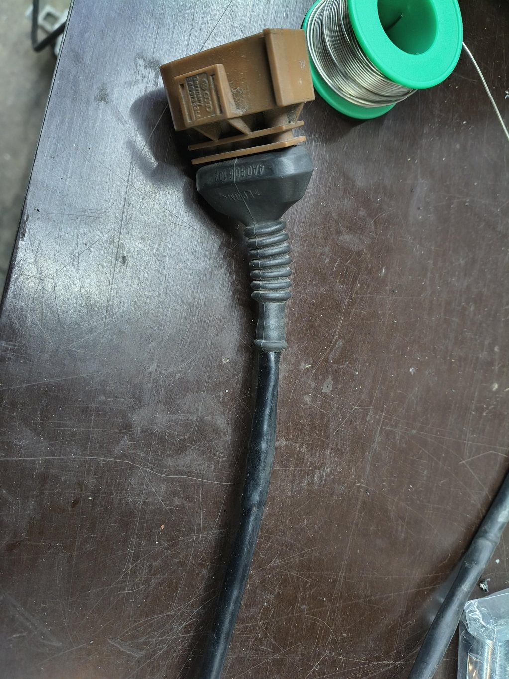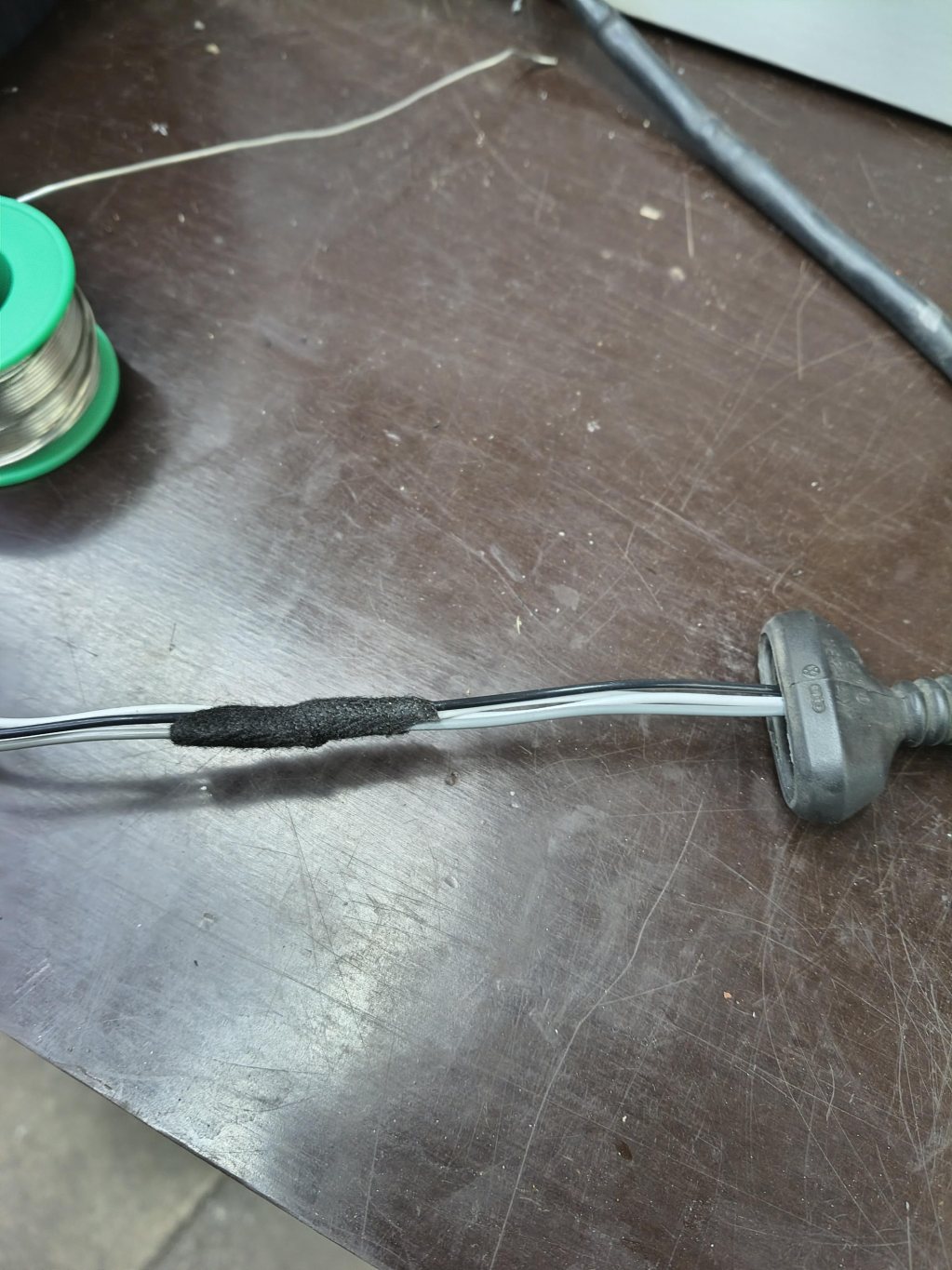 Följt av en jourvecka, då man sällan hinner göra någonting. I alla fall inte vad man planerar när man tänkt för då blir det alltid jobb. Så jourveckan passade jag på att montera i motor- och kupevärmare i min andrabil. Motorvärmaren gick att återanvända från min gamla A6 v8, kompletterade med ny intagskabel men vid kontroll i lådan efter en skarvsladd i lagom längd hittades komplett intagskabel så onödigt köp. Letade efter kupevärmare, defa har haft en med smal kabel istället för de grova som normalt dras i motorrummet. Hittade en sådan hos min närmaste reservdelsbutik, en öppnad förpackning med 2cm damm ovanpå. Intagskabel etc var bortplockat, men det hade jag ju 2 uppsättningar redan. En 500:- för en NOS kupevärmare kändes ok. Och jobbet hanns med under jourveckan, vad enkelt och mycket plats det är på en gammal passat 1.8t Så nu efter jourveckan var det dags att ta itu med gamla jobb, jag sket idag i abs-givaren då jag inte orkade hissa upp bilen... Det var dags att förlänga kablaget till en av de bakre lambdasonderna ( de flyttades bak lite när främre rören byttes) så kontaktstycket kunde sättas fast i sin hållare.