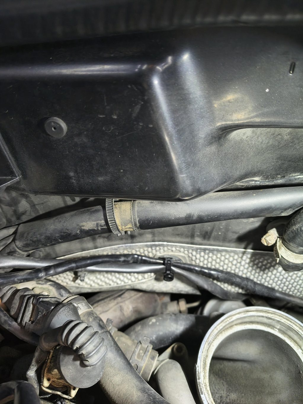 Små kattstrypare men då det blir rackarns varmt under huven litar jag inte på plastens hållbarhet över tid, i och för sig brukar slangarna fastna men med tanke på hur jobbigt det är att komma åt så känns ett haveri efter vägen väldigt jobbigt. Sen någon vecka tillbaka har en påse med 50 kinesiska klämmor dykt upp, så montage idag.