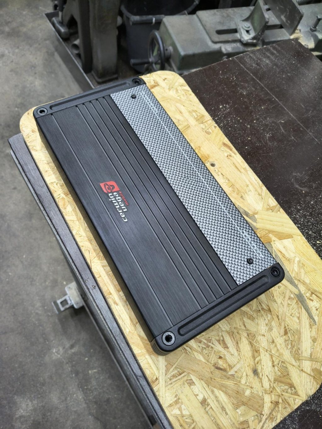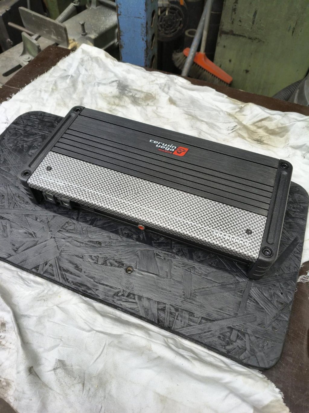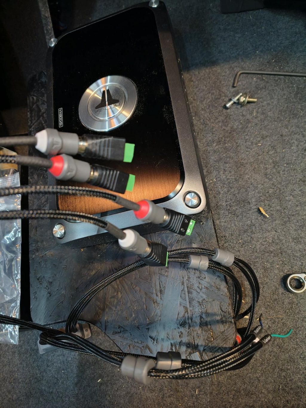 Det positiva är att den RCA-RCA kabel jag köpt för att koppla in bassteget till DSP anlände enligt plan. Nåväl, behövdes några fler lager färg på min platta för att den skulle bli vettigt svart, sedan skruvades bassteget på plats.