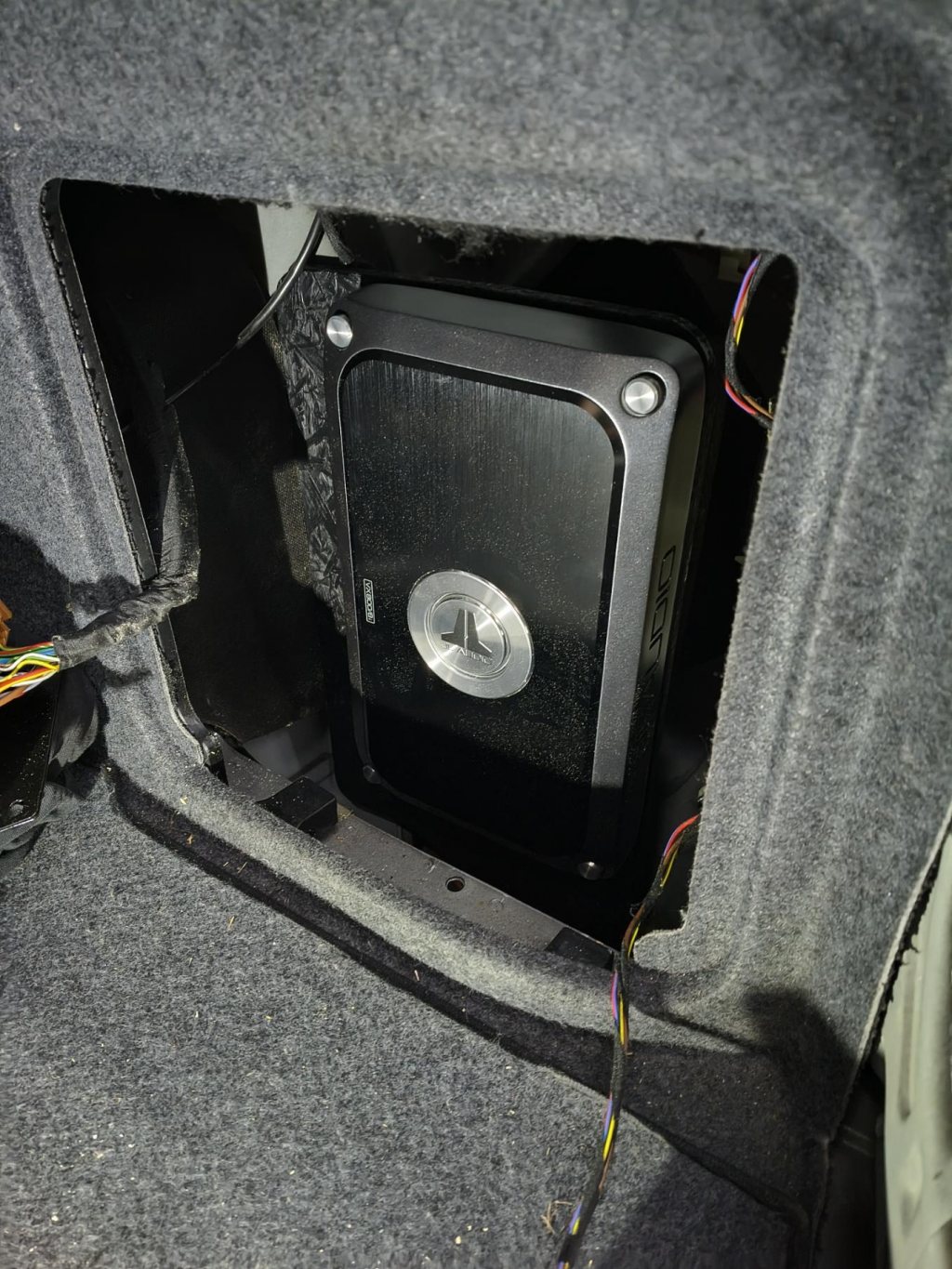 Och ut mot bagaget åtkompligt genom en servicelucka en kombinerad dsp och mångkanalförstärkare från JL Audio för att ersätta original Bose förstärkare.