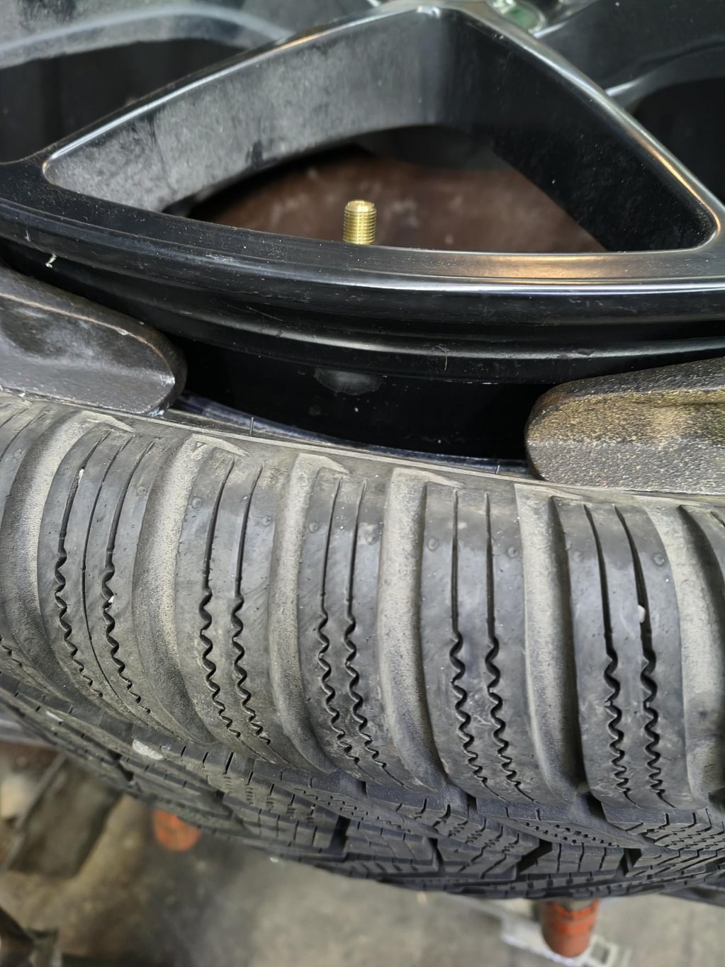 Hade tagit mig någon timme att bygga ny eller bygga om däckavtryckare, sedan skulle jag göra jobbet också. Och däcksbytarna förklarade att jag inte skulle klara att montera dit TPMS givare då däcket är ivägen. Utmaning accepterad, en planka för att skydda inre fälgsidan och två tvingar tryckte ihop däcket så flinka fingrar precis kunde komma förbi.