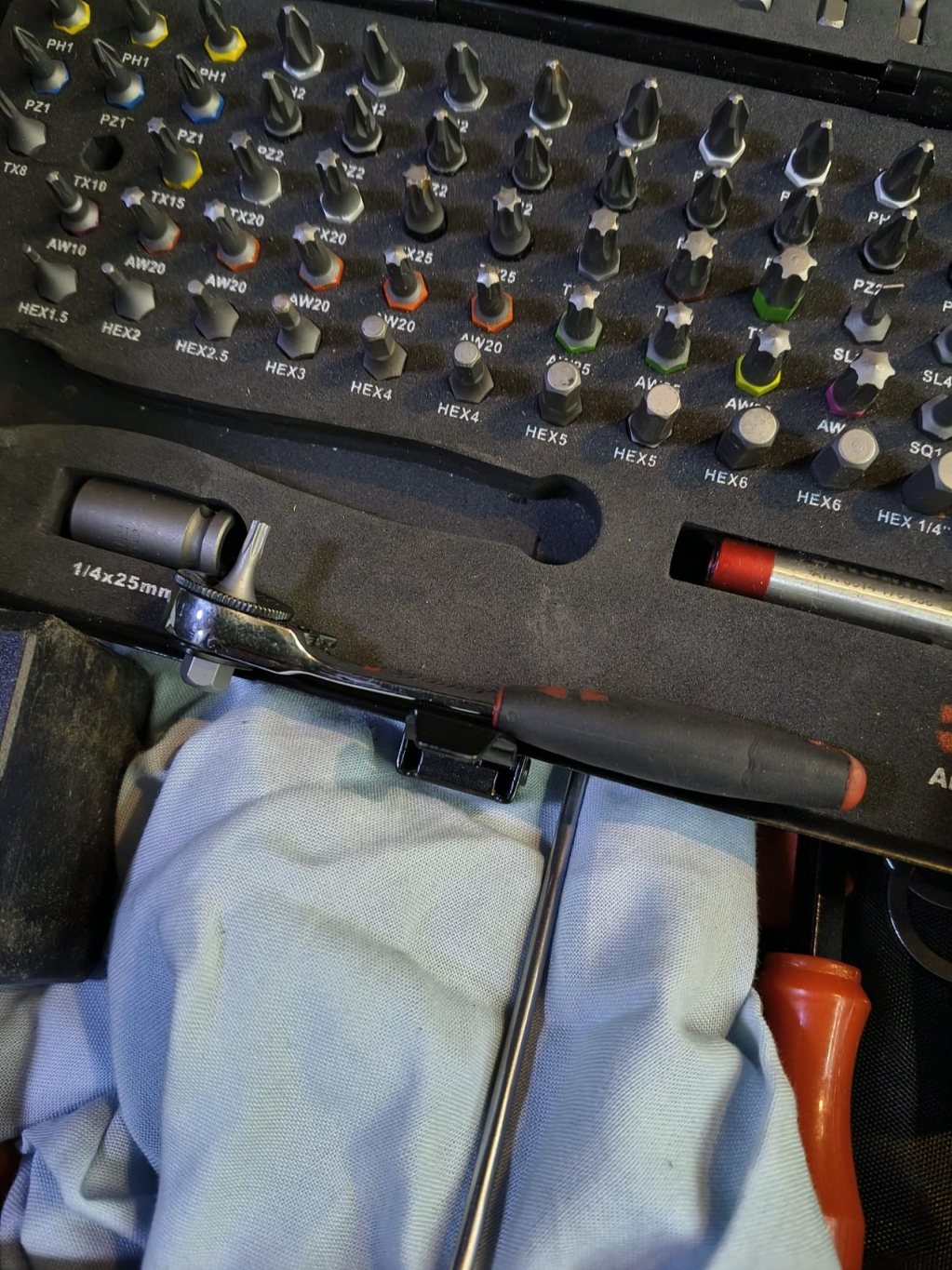 En av mina bättre kompisar vid dylika tillfällen är würths minispärrskaft för bits, och en jättesamling både vanliga och mindre vanliga bits. Har räddat mig så många gånger i jobbet när omöjliga skruvar blir möjliga