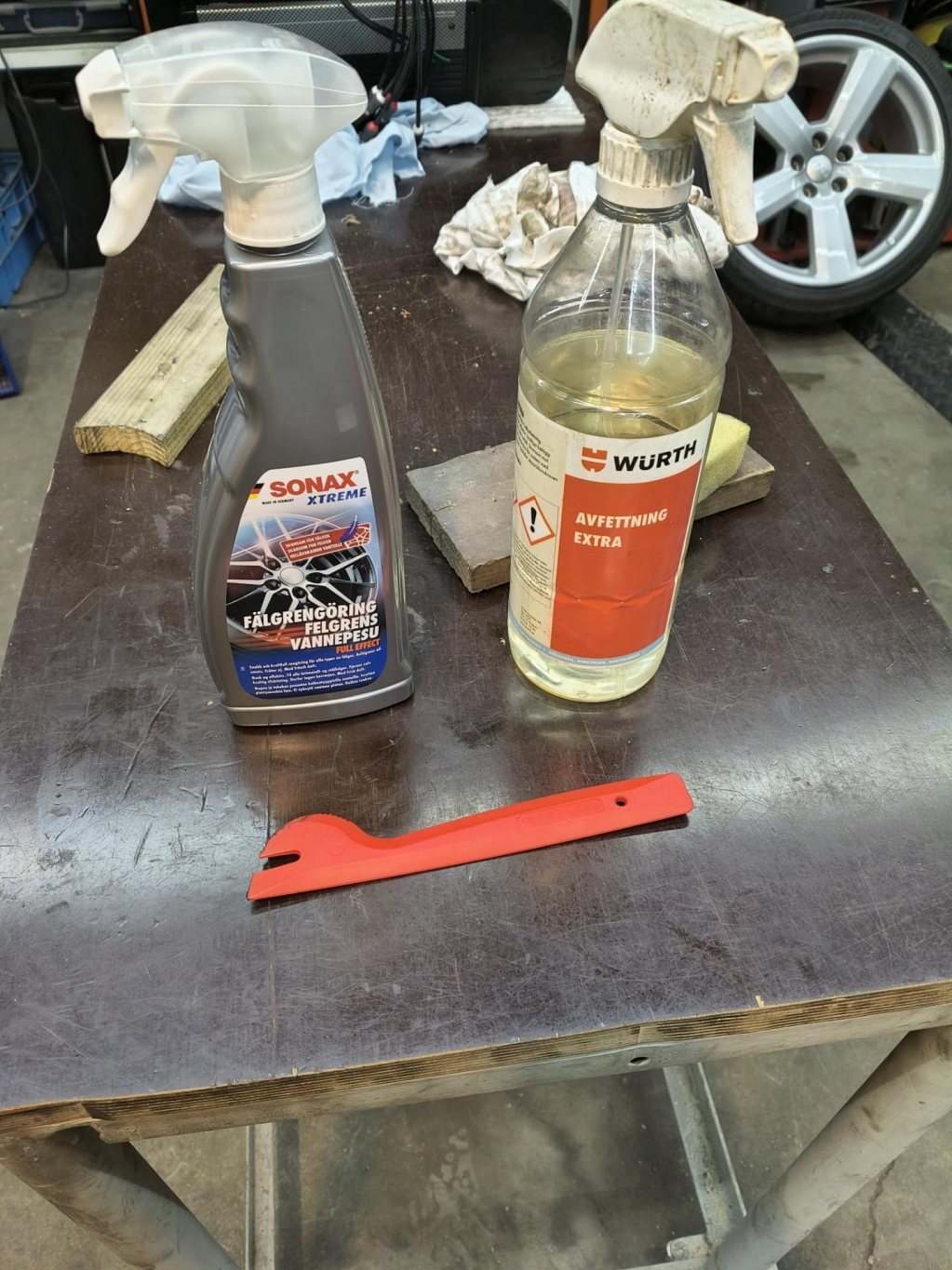 Grovrengöra hjul, sedan finrengöra allt som inte lossnat och avsluta med förvaring av hjulen. Tog hjälp av