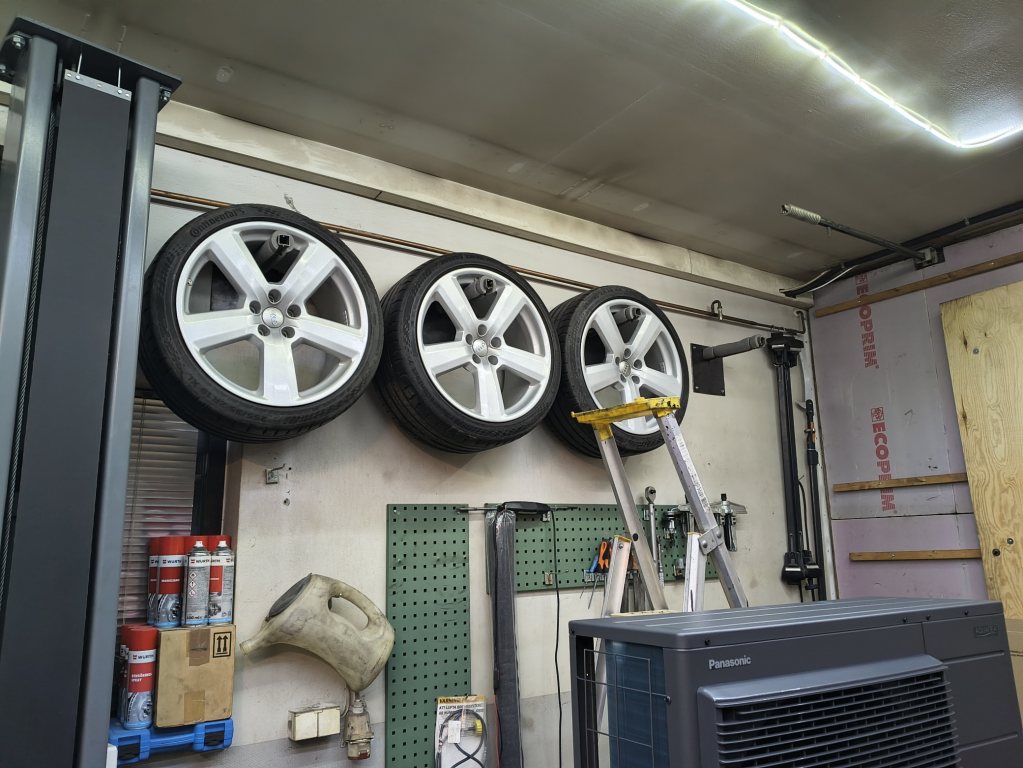 Dryg vecka sedan när jag skjutsade pappa till flygplatsen var det vitt på vägen, med andra ord dags att få på vinterdäcken. Men de ska ha givare innan de monteras. Första stoppet blev trycka av däcket från fälgen på ena sidan. Allt i utrustning för sådant i garaget är för racehojar, och då är fälgarna och däcken ungefär halva bredden mot mina vinterdäck. Så ingenting passade. Fick en lugn dag i fredags och inga jourjobb så iväg till en mobil däckbytare vid lokala köpområdet. Lite tur att det var milt fint väder och 7 grader också, var helt folktomt hos däckbytarna