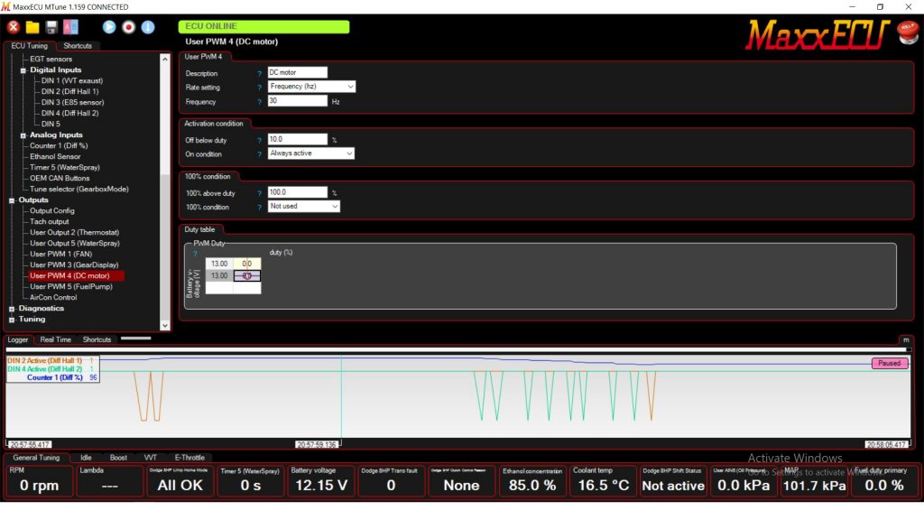 Nu funkade det hela väldigt bra så härnäst skall det dras kabel inuti bilen och prova på plats. För att frigöra IN och UTgångar på maxxecu på plugin härvan snodde jag från funktioner jag inte längre använder. kopplingspedal (DIN2) cruise controll rattknappar (DIN4), TankVent (GPO4) tomgångsventil (GPO5, GPO6) DISA (GPO8).
