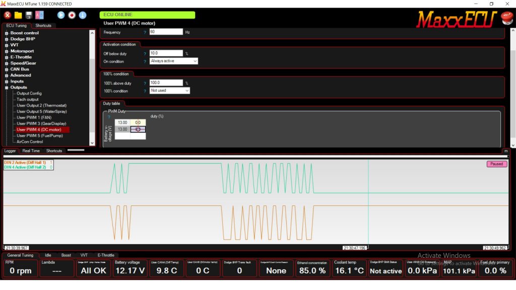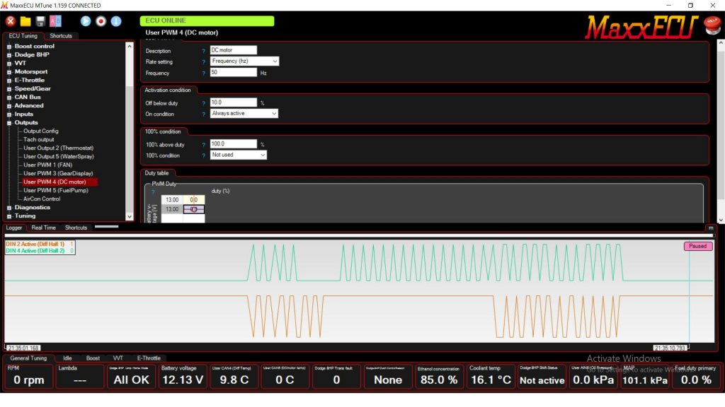 Jag provade istället använda 2 digitalingångar direkt på maxxecu och det fungerade klockrent direkt. väldigt snygg och korrekt pulståg på både kanalerna. Det blir en del extra kabeldragning från baktill på bilen men hellre det än en dålig funktion.