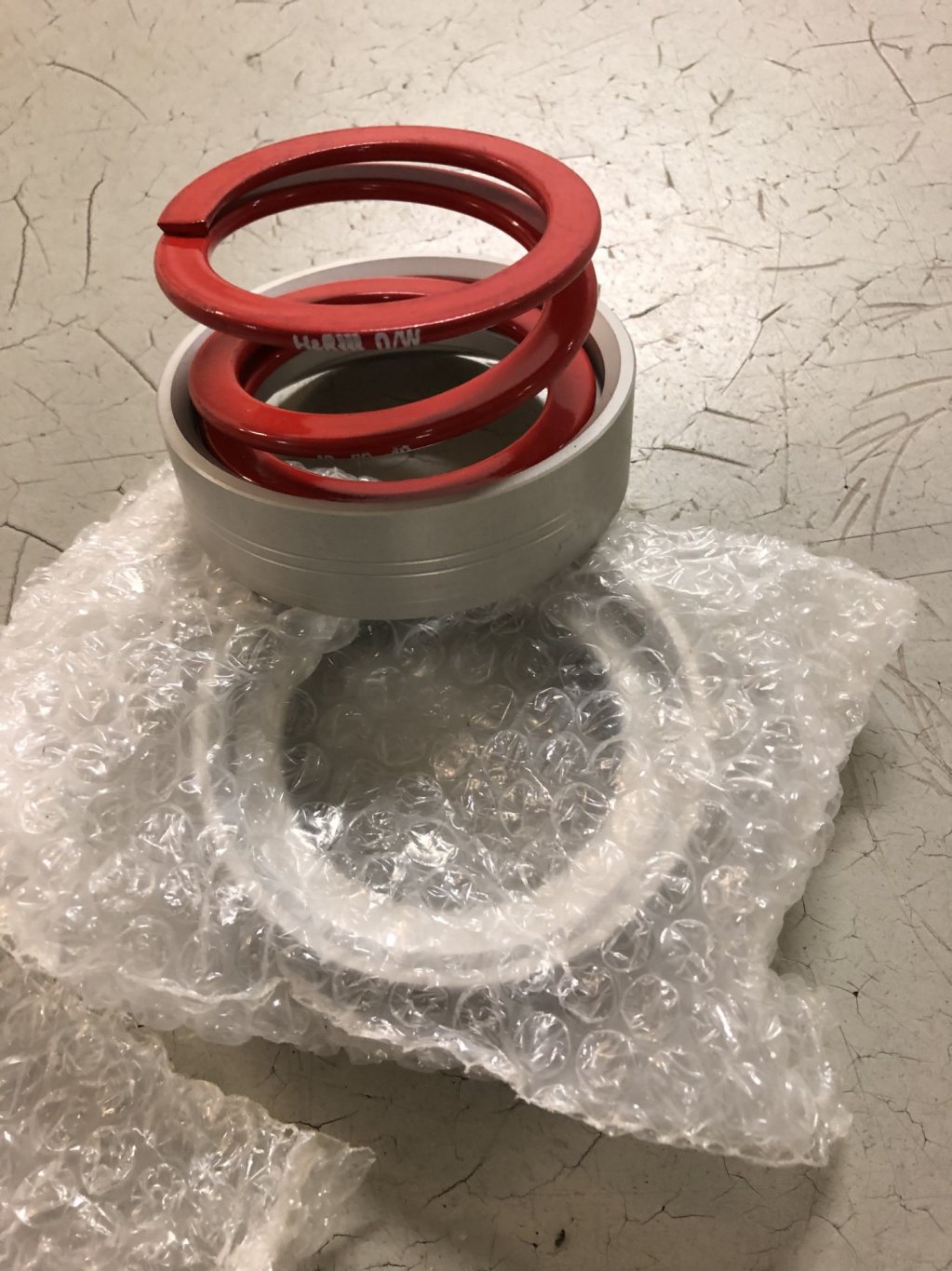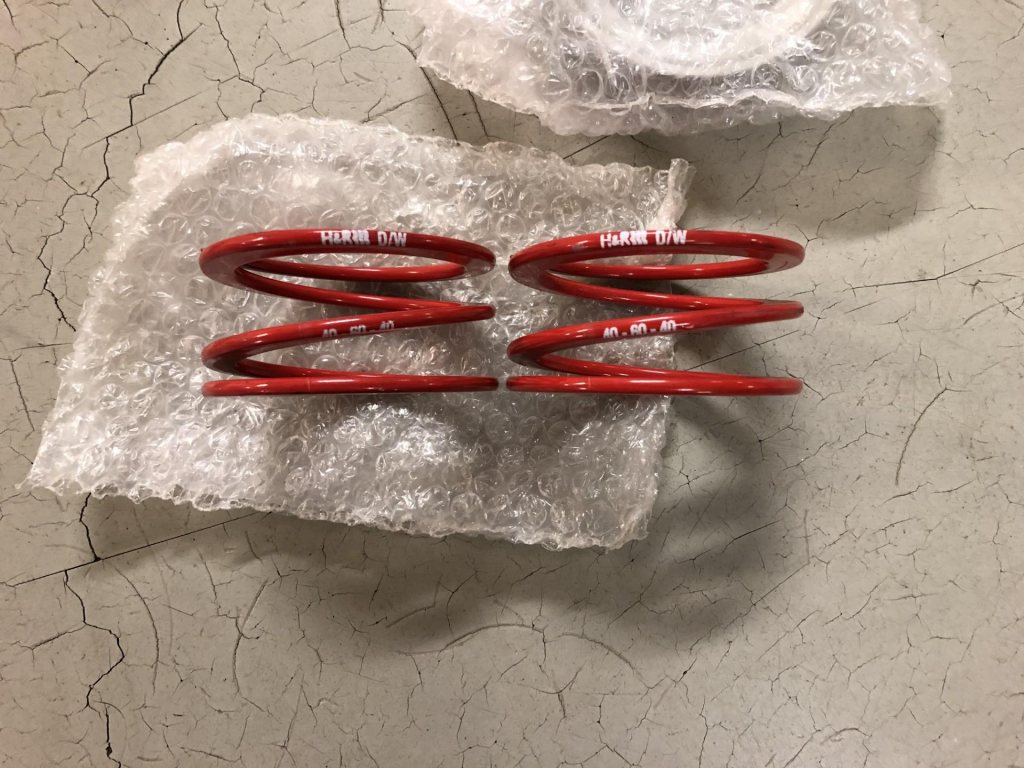 Hjälpfjädrar H&R, 60mm innerdiamter, längd 40 mm, fjäderkonstant 40 N/mm och bygghöjd 16 mm komprimerade. Millway utvändiga styrningar. Provmonterade men inte använda sen. 500 kr (dagspris fjädrar på BMC 2x560 kr och styrningarna 2x334 kr hos Millway)
