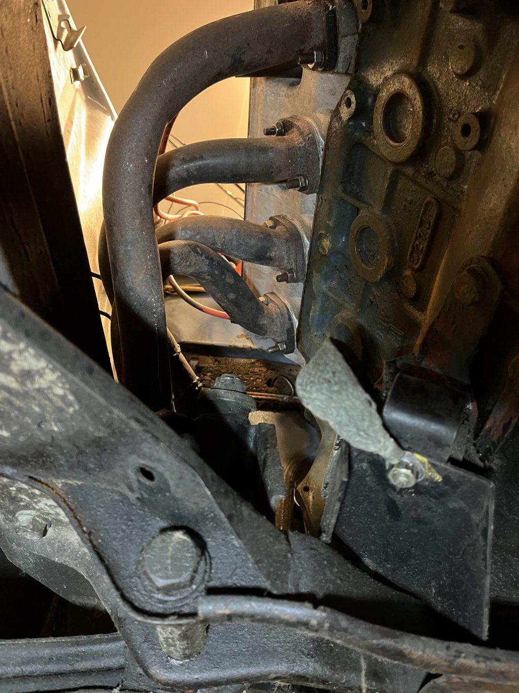 Skruvkit snyggt förpackat sen senast så bara att skruva ihop. Lite pyssel var dwt sedan att få motorfästena på plats men efter lite lirkande ,skruvande och våld så löste sig även det. Hann även montera kylstemet men när det kom till avgassystemet så saknas det typ en halvmeter rör ( kom ihåg när jag låg under bilen att den aldrig mer skulle gå som sugis så hade jag modifierat lite i framkant, ja ja motorn sitter på plats iallafall och går att snurra med startmotorn