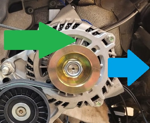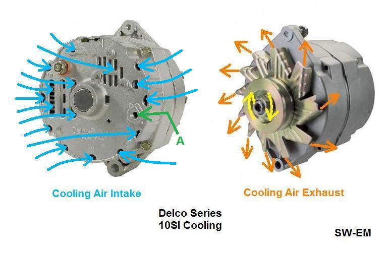 Fläkten drar in luft i centrum, dvs inne vid generatoraxeln, och kastar ut den radiellt. Du skall mata luften i bakkant på generatorhuset om det skall komma mer kalluft till kylningen. Nu är det som om du hade motorkylarens fläkt kopplad för att blåsa framåt i bilens färdriktning. Din fläkt sitter inte exponerad men principen är densamma.