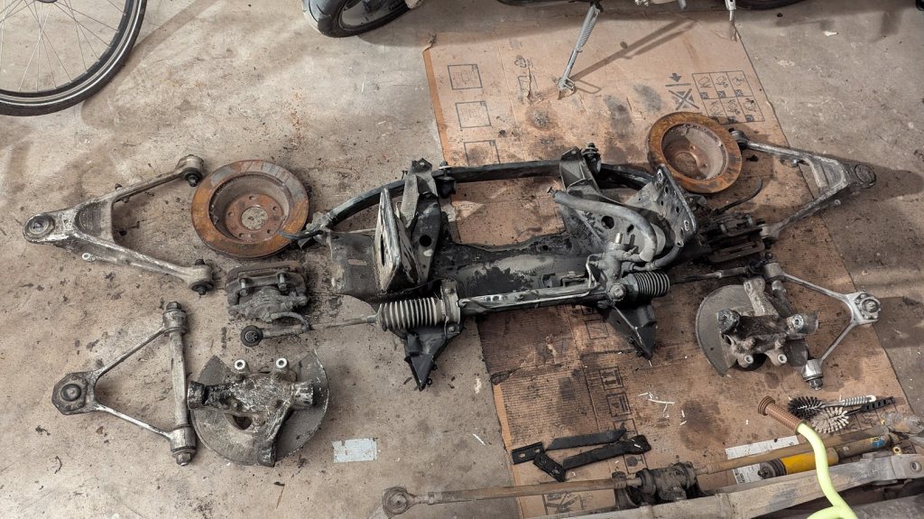 Nu är det mesta av framvagnen isär och jag ska ägna mig åt att göra grejerna rena och fräscha. Det mesta är i bra mekaniskt skick (utom bussningarna som är torra och trista) men det är så skitigt att jag knappt kan titta på det utan att också bli supersmutsig. Så nu blir det en rejäl omgång med avfettning och skrubba och så småningom glasblästra en del av det. Önskar mig nya bussningar, spindelleder, bromsslangar, belägg och lite annat av hjultomten. Får se när han kan tänkas leverera. Om någon vet var man bäst köper ett Corvette C4 bussningskit från Superpro är jag intresserad.