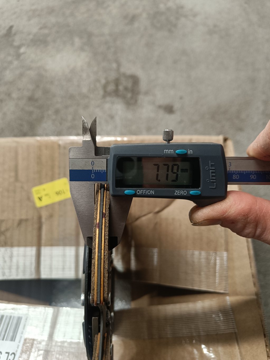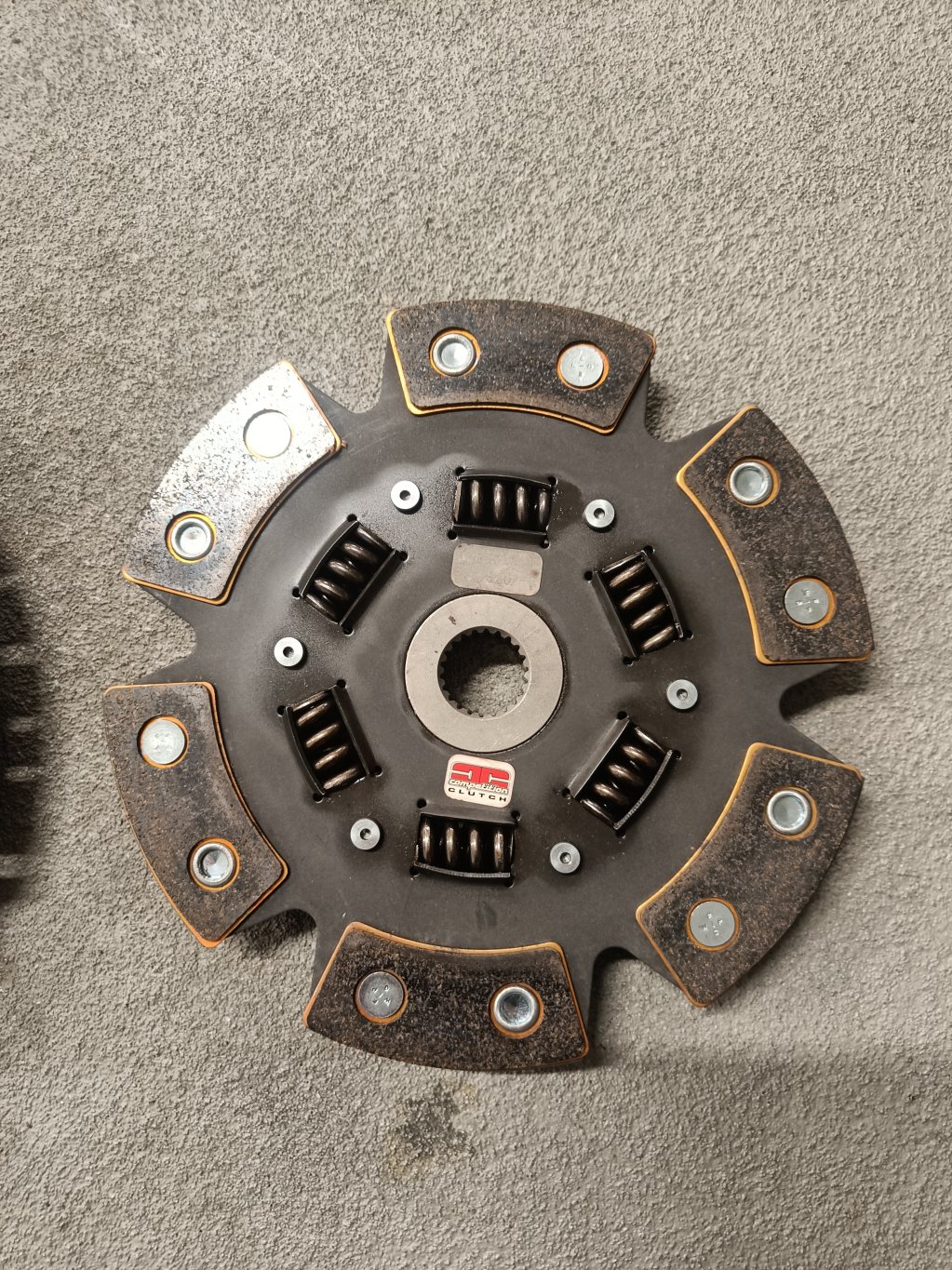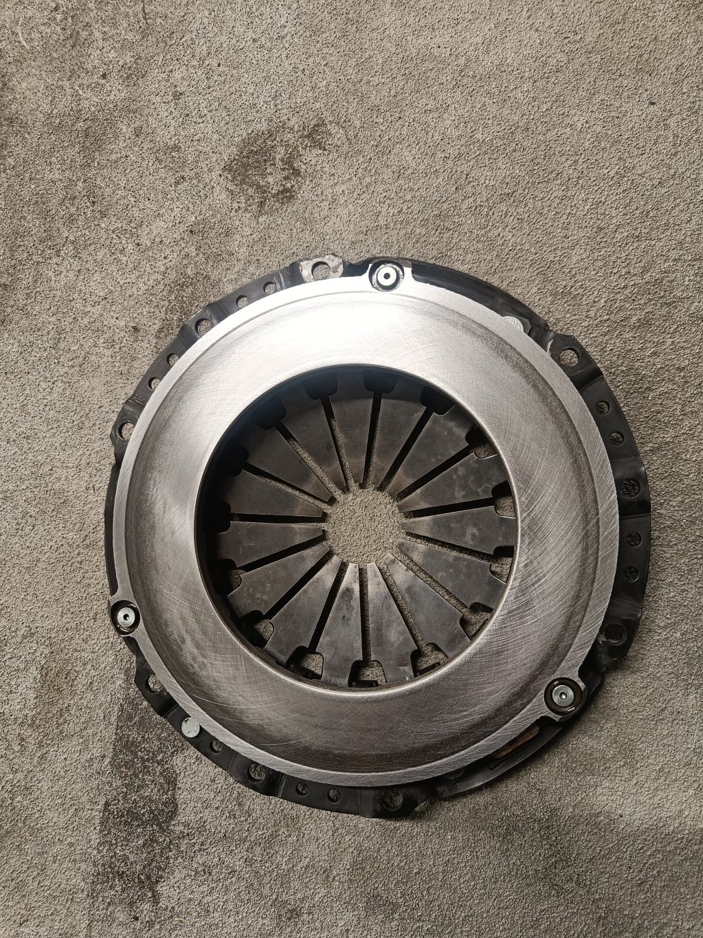 Lamellen mäter 7.8mm, och ska enligt CC bytas vid 5.8mm, så finns en del liv kvar! Tryckplattan har lite slitage på anläggningsytan av lamellen, kanten känns knappt med nageln. Men körde av den med ett slippapper och ytan är jämn och fin i övrigt. Har även ett helt original svänghjul som fås med, är i liknande skick som tryckplattan. Nypriset verkar vara ca 5000kr för kopplingen endast, tänkte mig 2000kr för allt, men är öppen för bud om det är fel.