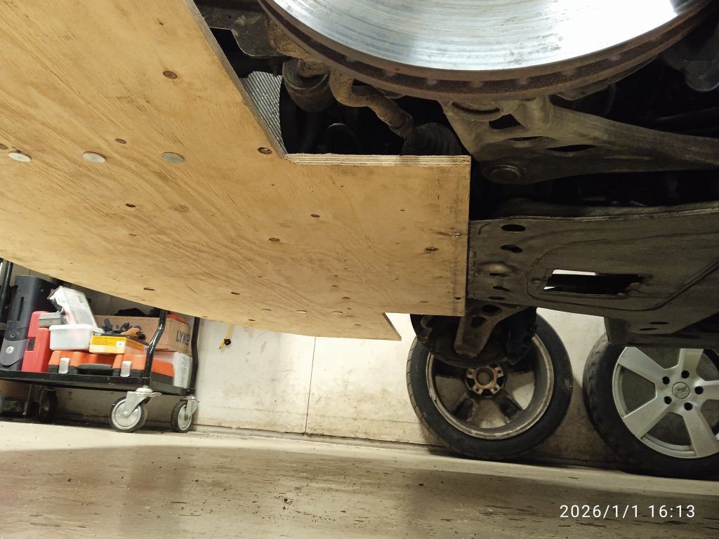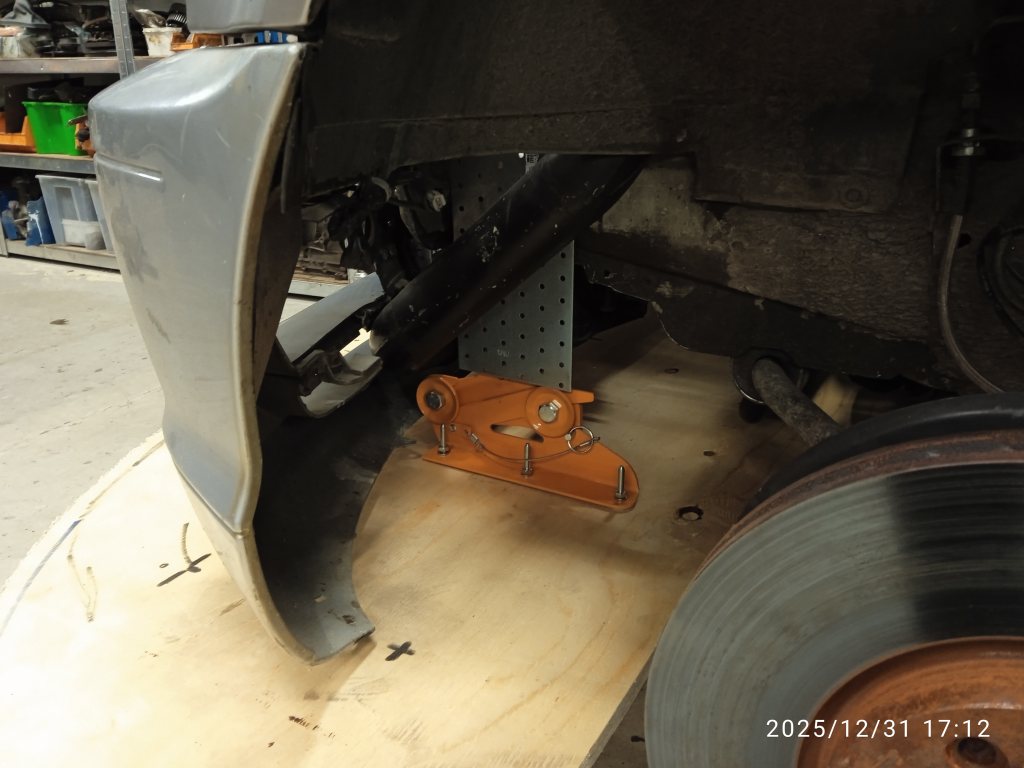 Bakändan ansluter till aluplåten under motorn. Skall skruva dit en skena så man inte behöver krypa under bilen för att montera splittern.
