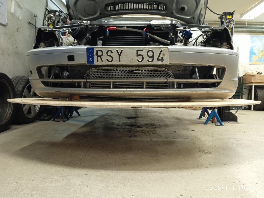 Nu sitter splittern där. Skall såga ut för hjulen och sänka ner bilen för kolla höjd. Den sitter i högsta läget just nu. Siktar på 8-10cm ovanför marken. Färg,stag och "airdam" återstår.