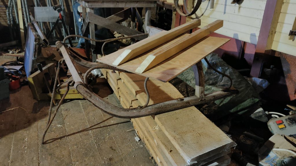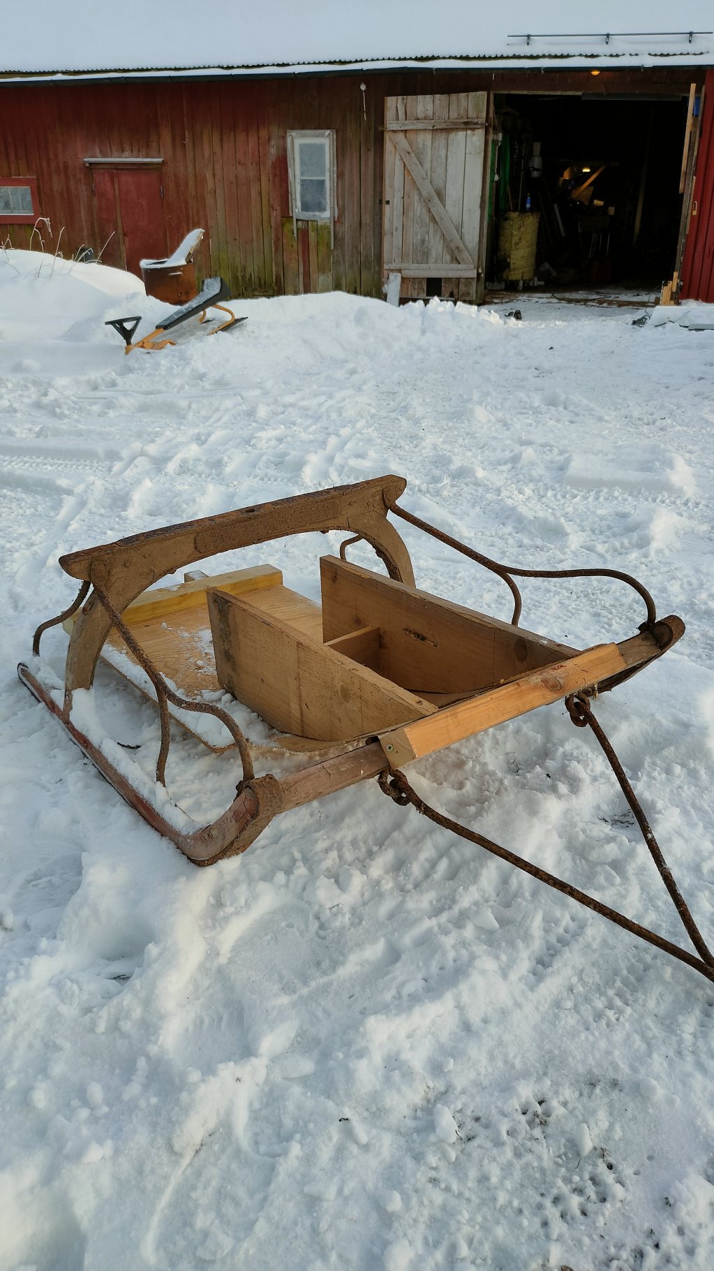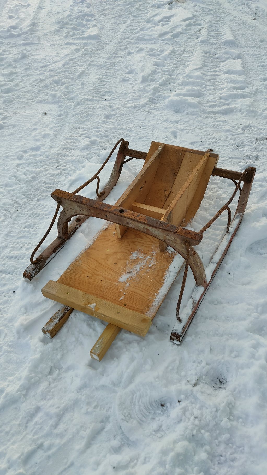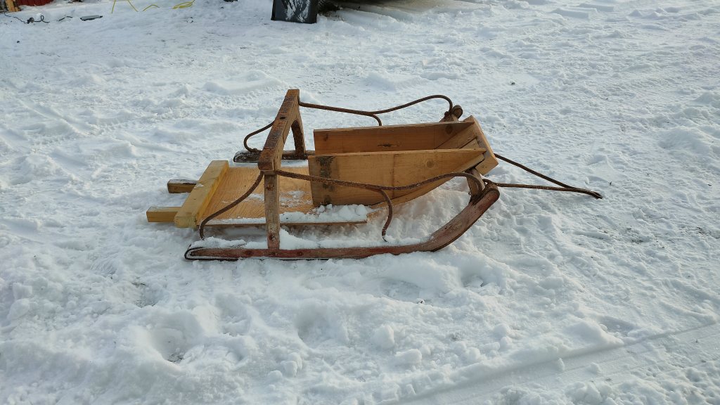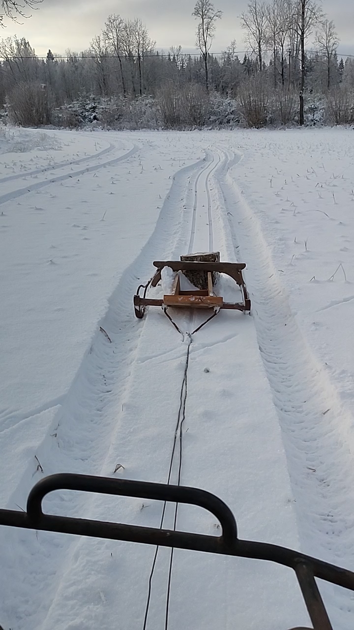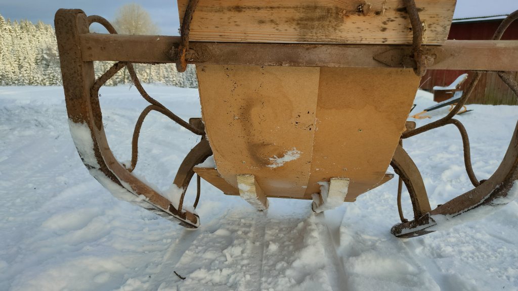 Bra att ha grejer från ladan blev en spårsläde. Ska provåka spåren strax. Skulle nog behöva en vält först, innan man drar spår.