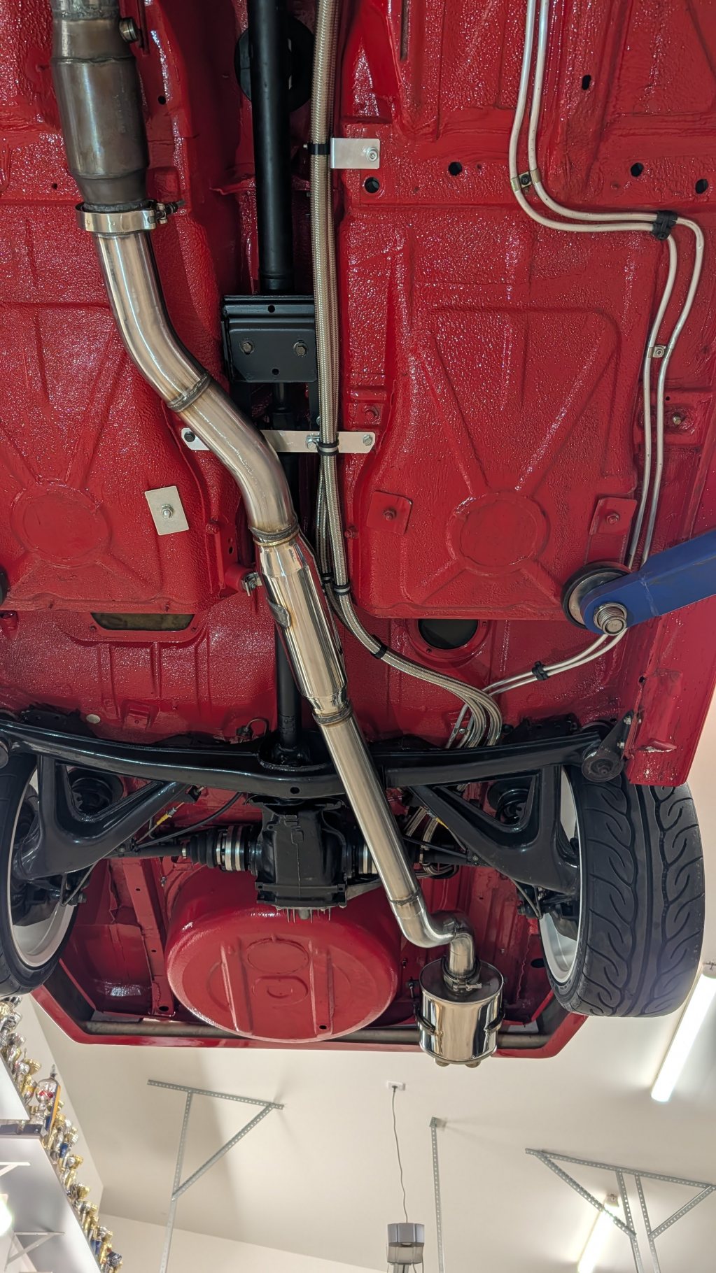 Tidigare avgasrör var 2,5", motorn behöver 3", så fick bygga ett nytt system liknande det förra. Byggde om det något från denna bild då bilen är så låg så vred jag upp katalysatorn tidigare mot kardan tunneln och monterade värmesköld ovanför. Här syns även en del av torrsumpssystemet, hua vad slang och koppling det har gått åt i bygget, men lika bra och göra allt ordentligt. Tanken blev monterad i bakluckan.