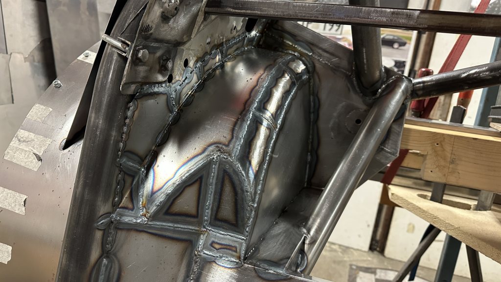 Nu har jag helsvetsat kupédelen av rörchassit. Bakre stötdämpartornen är också färdigsvetsade. Bakre hjulhusen är det fortfarande en del jobb kvar på. Svetskvalitén varierar mellan hyfsad till ganska dålig, delvis beroende på dålig ergonomi (trots chassisnurran) och delvis att det några gånger bubblade en del i svetsarna, kanske pga att rost hade bildats i fogen. TIG är ju väldigt känsligt för kontaminering. Som tur är är de sämsta svetsarna mestadels mellan plåtar och inte i själva rörfogarna. Sen har jag kanske legat av mig lite vad gäller svetsande också... Skönt att ha kommit så här långt i alla fall! I YouTubevideon berättar jag också lite om några tidiga konstruktionsbeslut (för cirka 25 år sen...)!