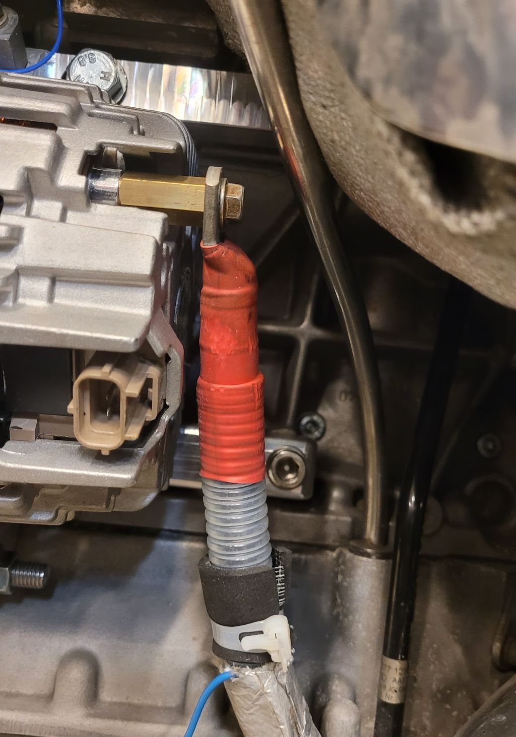 Kylfläkten som blåser framtill är större och med grövre slang som jag först funderade på att dela, men den mindre som nu blåser på ampere sensorn borde räcka för att blåsa in på baksidan av generatorn så kanske man istället ska bygga in ampere sensorn i någon låda där luften får passera igenom och sedan blåsa in bak på generatorn?