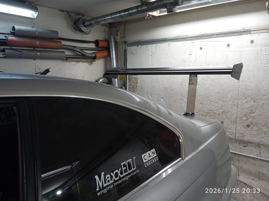 Sedan har jag byggt om fästen för nya större vingen. Nu är den i höjd med taket för att få ostörd luft och har justerbar vinkel. fästen gjorda i 3mm alu. Blev stadig. Jag skall snygga till spackla/måla fästerna så dom blir släta och förhoppnings lite snyggare.... Just nu ser det mest ut som från någon parodi. Men funktion är vad som gäller. Stora endplates skall också på...