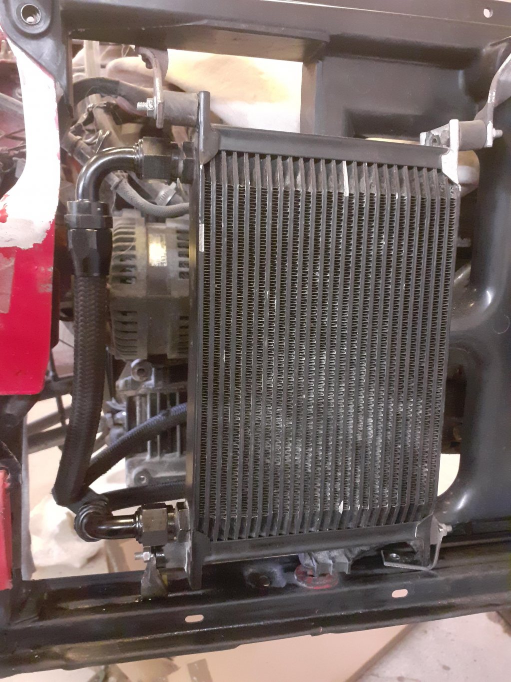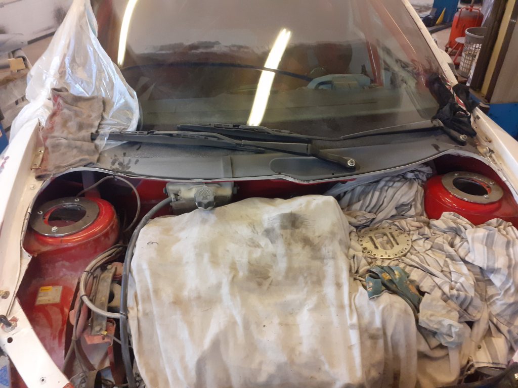 Kold dag på værkstedet idag, startede med at lobe tor for gas til varmekanonen, efter en halv times tid gik strommen til kompressor og varmepumpe, jeg kunne ikke tænde det igen uden at den slog fra med det samme. Så havde jeg kun min lille 2kw varmeblæser til 100m2 værksted. Nå men jeg fik lavet mine forstærkninger i begge tårne, kraftige 6mm skiver på begge sider, med bolte igennem. Også rykket lidt over 1 cm ud af så den kan få lidt mindre camber. Fik kortet slangerne til oliekoleren, efter 2 forsog så passede det lækkert.